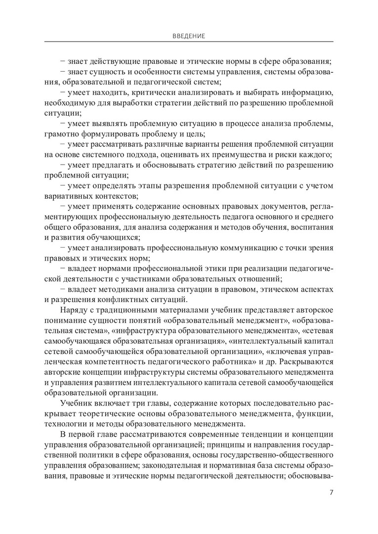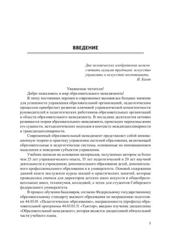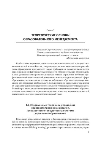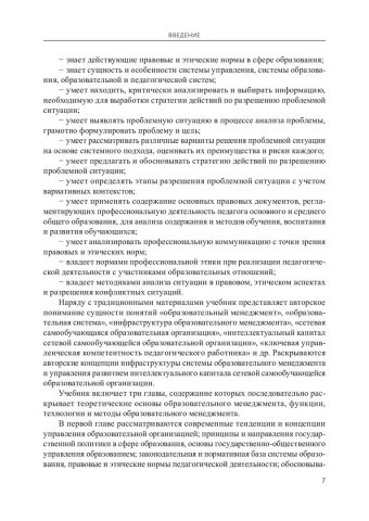 Аннотация: Представлены теоретико-методологические основания современного образовательного менеджмента и материалы практикумов (контрольные вопросы, практические задания, тесты). Обобщены подходы к образовательному менеджменту как к науке и искусству управления системой образования, образовательными и педагогическими системами. Значительное внимание уделено технологиям инновационного образовательного менеджмента, в том числе авторским технологиям управления развитием интеллектуального капитала сетевых самообучающихся образовательных организаций, а также методам непрерывного профессионального образования, самообразования педагогов и коучинга. Рассмотрены технологии разработки управленческих решений в сфере образования, методы формирования корпоративной культуры, имиджа образовательной организации и педагога. Предназначен для студентов, обучающихся по образовательным программам 44.04.01.06 «Менеджмент образовательных инноваций» направления подготовки 44.04.01 «Педагогическое образование» (магистратура) и 44.03.01.31 «Тьютор» направления подготовки 44.03.01 «Педагогическое образование» (бакалавриат). Будет полезен аспирантам вузов и слушателям системы дополнительного профессионального образования, а также специалистам в области образовательного менеджмента.