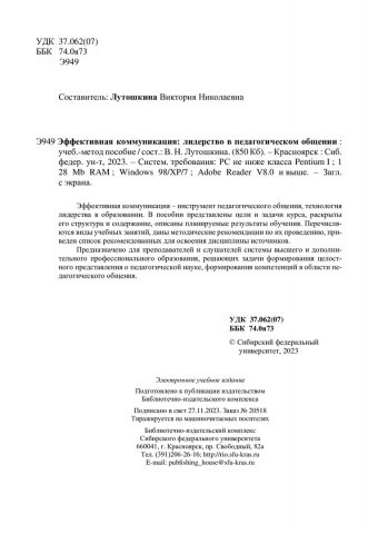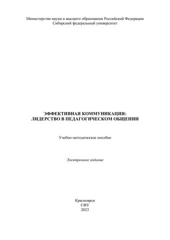 Библиографическое описание:Эффективная коммуникация: лидерство в педагогическом общении : учебно-методическое пособие / сост. В. Н. Лутошкина. - Электрон. текстовые дан. (pdf 1 Мб). - Красноярск : СФУ, 2023 (2023-11-27). - 25 с. - Загл. с титул. экрана. - Изд. № 2023-20518 : Б. ц. - Текст : электронный.