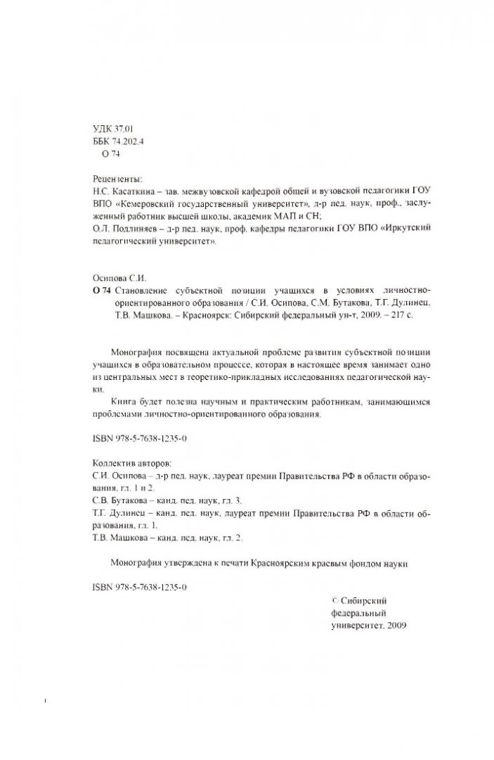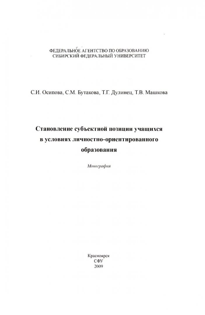 Библиографическое описание:Становление субъектной позиции учащихся в условиях личностно-ориентированного образования : монография / С. И. Осипова, С. М. Бутакова [и др.] ; Сиб. федер. ун-т. - Красноярск : СФУ, 2009. - 216 с. : табл. - (Библиотека журнала СФУ. Гуманитарные науки). - Списки лит. в конце гл. - ISBN 978-5-7638-1235-0 : 210 р. - Текст : непосредственный + Текст : электронный.