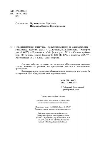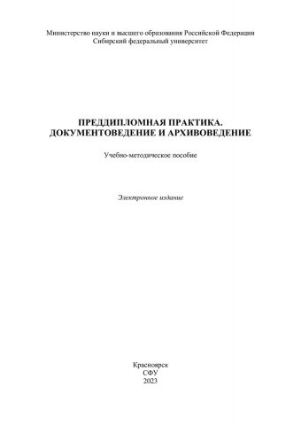 Библиографическое описание:Преддипломная практика. Документоведение и архивоведение : учебно-методическое пособие / Сиб. федер. ун-т, Гуманитар. ин-т ; сост.: А. С. Жулаева, Н. В. Пахомова. - Электрон. текстовые дан. (pdf, 1 Мб). - Красноярск : СФУ, 2023 (2023-08-16). - 55 с. - Загл. с титул. экрана. - Изд. № 2023-19627 : Б. ц. - Текст : электронный.