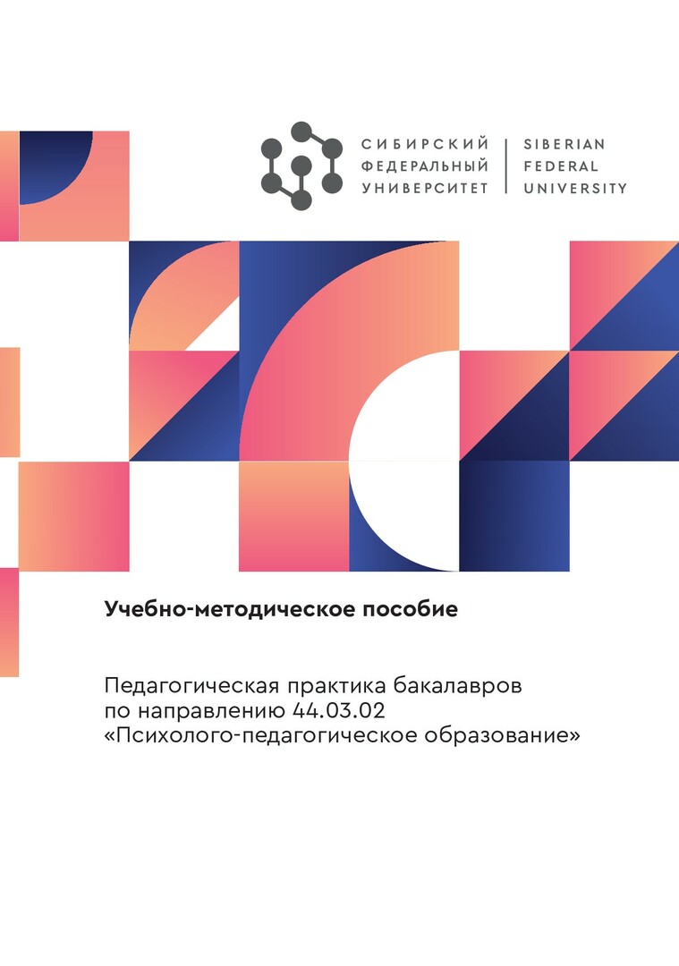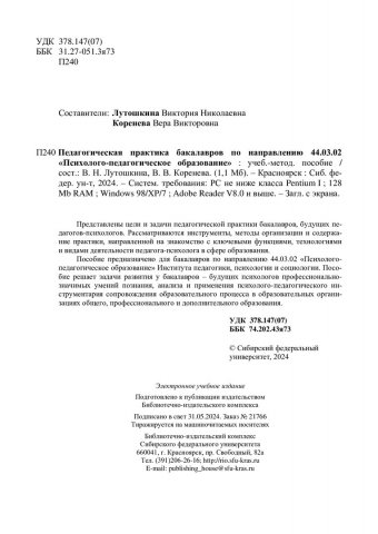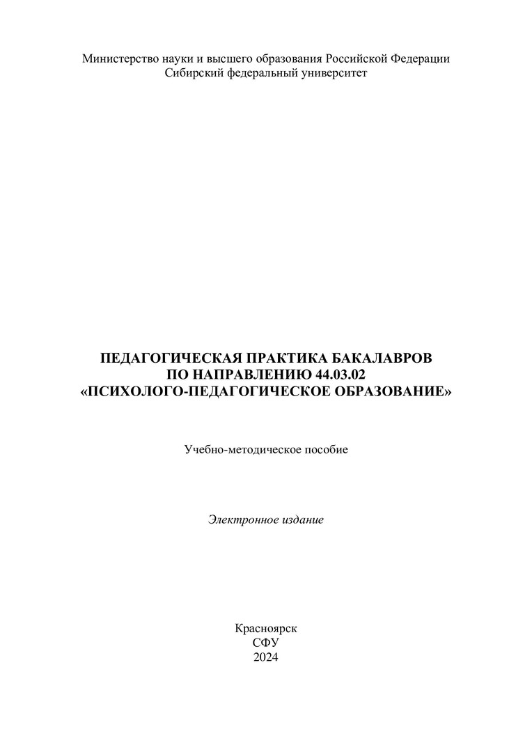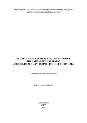 Библиографическое описание: Педагогическая практика бакалавров по направлению 44.03.02 "Психолого-педагогическое образование" : учебно-методическое пособие / Сиб. федер. ун-т, Ин-т педагогики, психологии и социологии ; сост.: В. Н. Лутошкина, В. В. Коренева. - Электрон. текстовые дан. (pdf, 1,2 Мб). - Красноярск : СФУ, 2024 (2024-05-31). - 67 с. - Загл. с титул. экрана. - Изд. № 2024-21766 : Б. ц. - Текст : электронный.