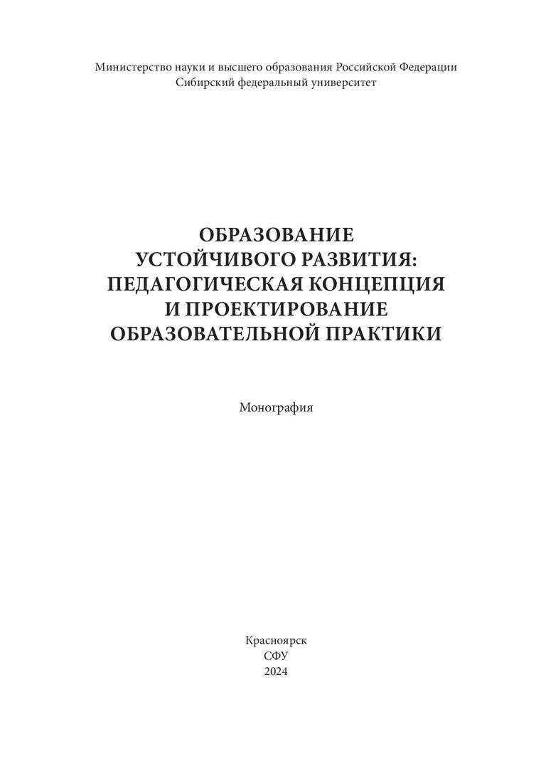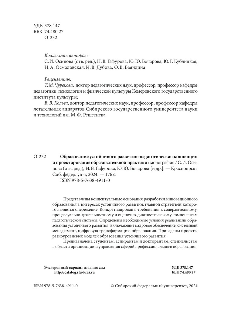 Библиографическое описание: Образование устойчивого развития: педагогическая концепция и проектирование образовательной практики : монография / С. И. Осипова, Н. В. Гафурова, Ю. Ю. Бочарова [и др.] ; отв. ред. С. И. Осипова ; рец.: Т. М. Чурекова, В. В. Кольга ; Сибирский федеральный университет, Институт цветных металлов. - Электрон. текстовые дан. (3,0 Мб). - Красноярск : СФУ, 2024 (2024-05-27). - 176 с., 11.0 усл. печ. л. : табл. - Загл. с титул. экрана. - Электрон. версия печ. публикации . - Библиогр.: с. 160-173. - 500 экз. - ISBN 978-5-7638-4911-0 : Б. ц. - Изд. № 2023-20483. - Текст : электронный.