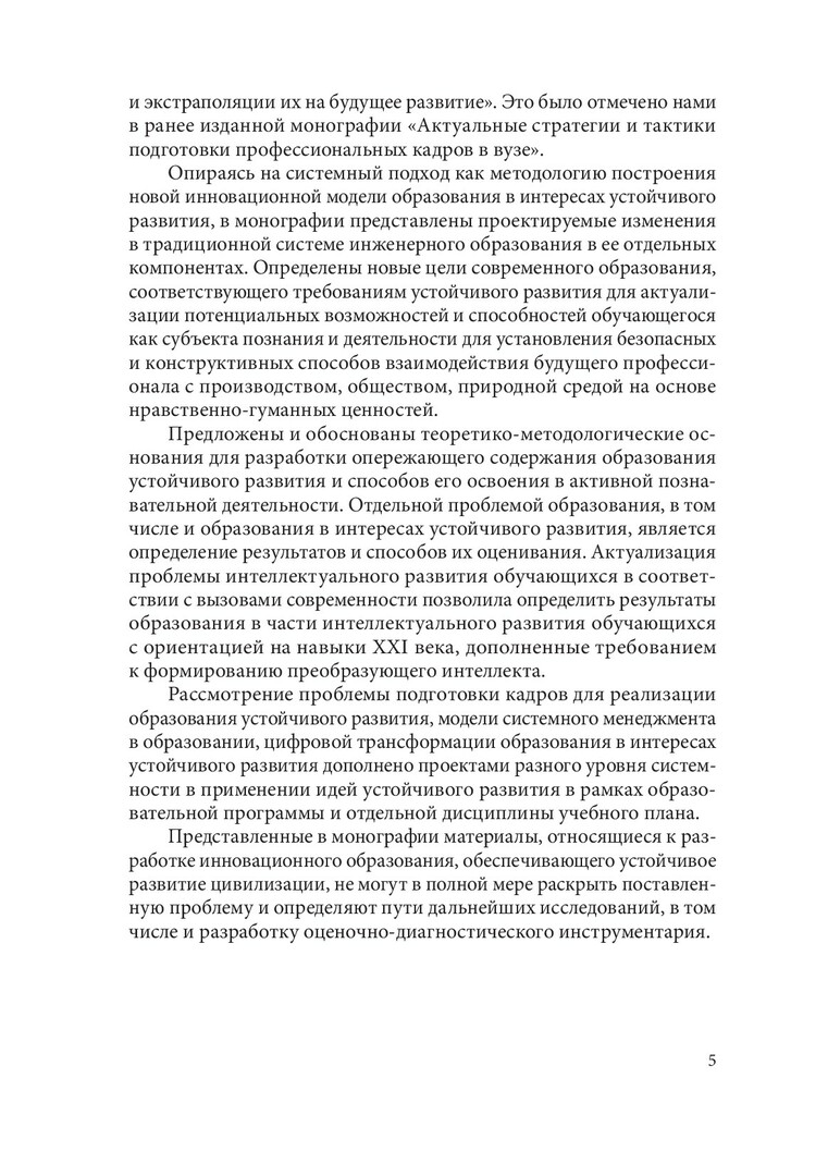 Аннотация: Представлены концептуальные основания разработки инновационного образования в интересах устойчивого развития, главной стратегией которого является опережение. Конкретизированы требования к содержательному, процессуально-деятельностному и оценочно-диагностическому компонентам педагогической системы. Определены необходимые условия реализации образования устойчивого развития, включающие кадровое обеспечение, системный менеджмент, цифровую трансформацию образования. Приведены проекты разноуровневых моделей образования устойчивого развития. Предназначена студентам, аспирантам и докторантам, специалистам в области организации и управления сферой профессионального образования.