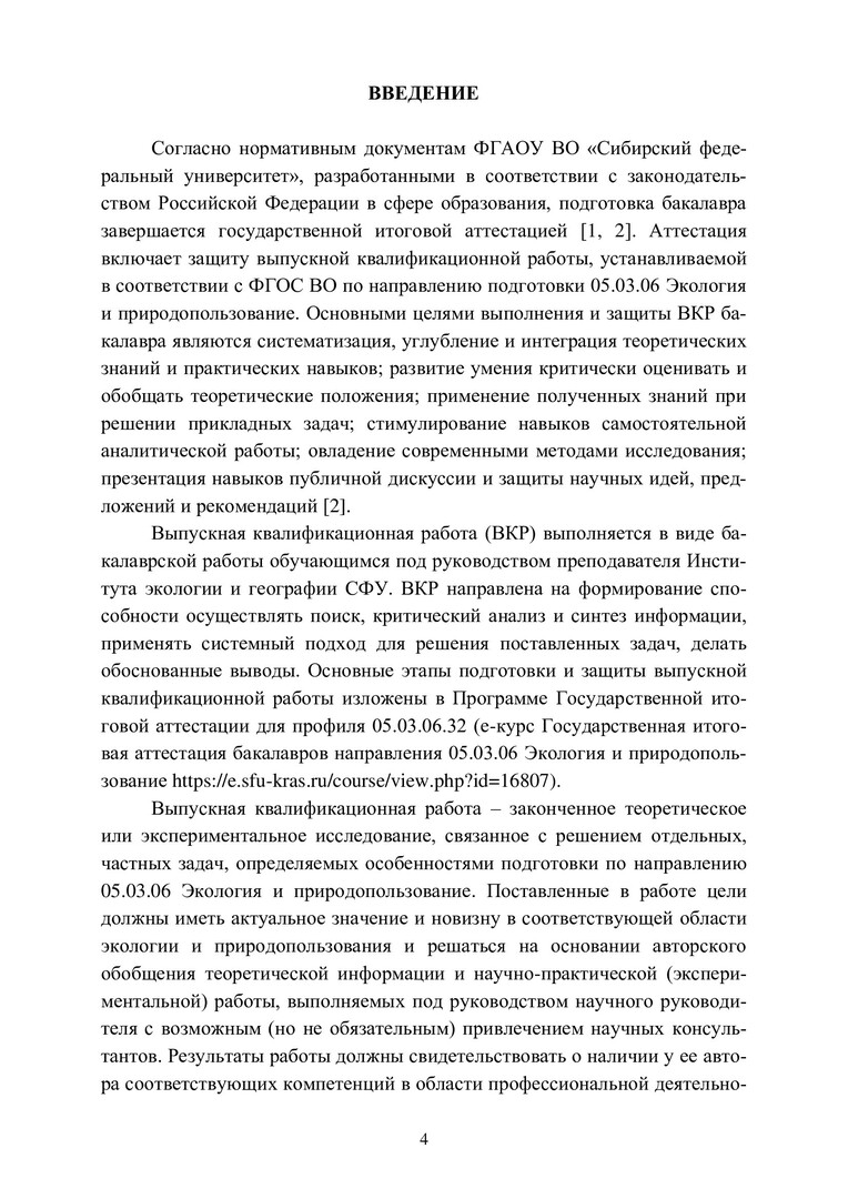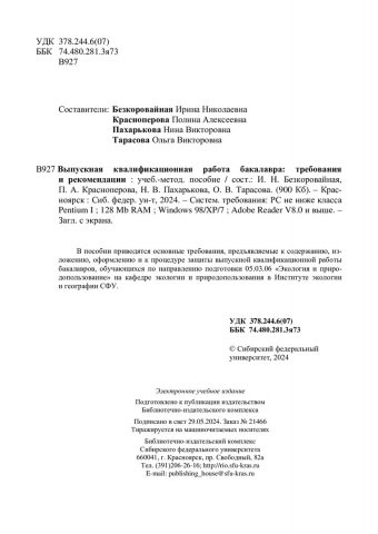 Библиографическое описание:Выпускная квалификационная работа бакалавра: требования и рекомендации : учебно-методическое пособие / Сиб. федер. ун-т, Ин-т экологии и географии ; сост. И. Н. Безкоровайная [и др.]. - Электрон. текстовые дан. (pdf, 1 Мб). - Красноярск : СФУ, 2024 (2024-05-29). - 35 с. - Загл. с титул. экрана. - Изд. № 2024-21466 : Б. ц. - Текст : электронный.