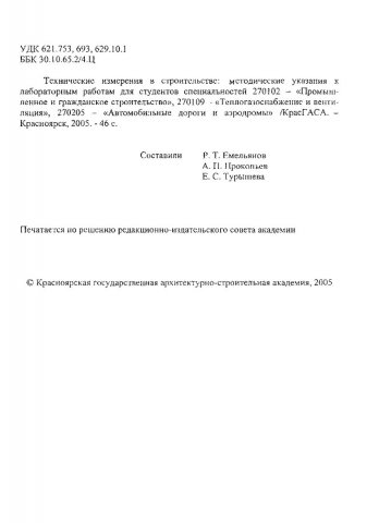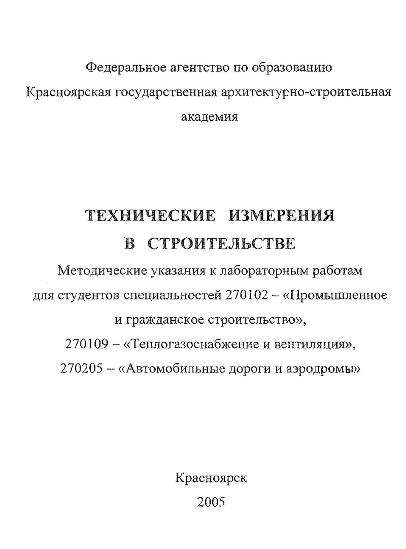 Библиографическое описание:Технические измерения в строительстве : методические указания к лабораторным работам для студентов специальностей 270102 "Промышленное и гражданское строительство", 270109 "Теплогазоснабжение и вентиляция", 270205 "Автомоб. дороги и аэродромы" / сост.: Р. Т. Емельянов, А. П. Прокопьев, Е. С. Турышева. - Красноярск : КрасГАСА, 2005. - Текст : электронный.