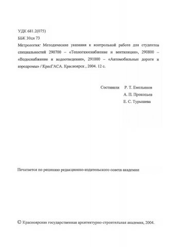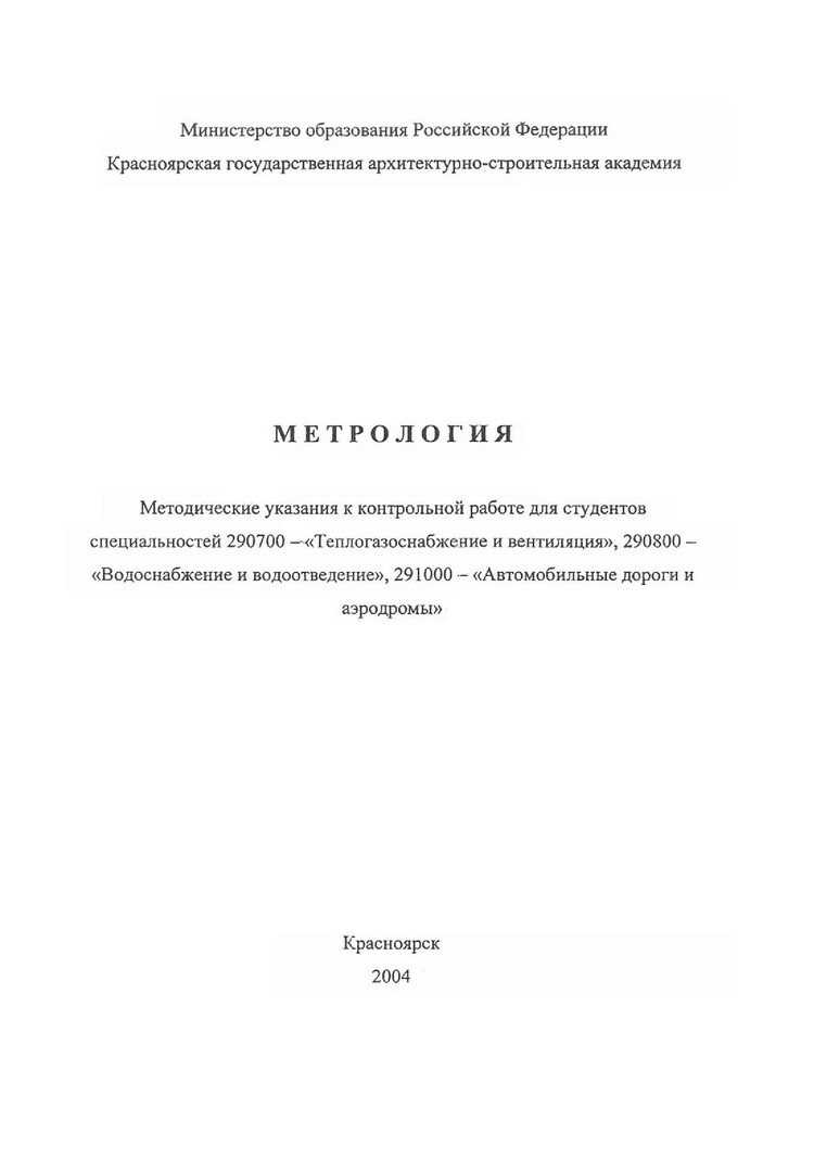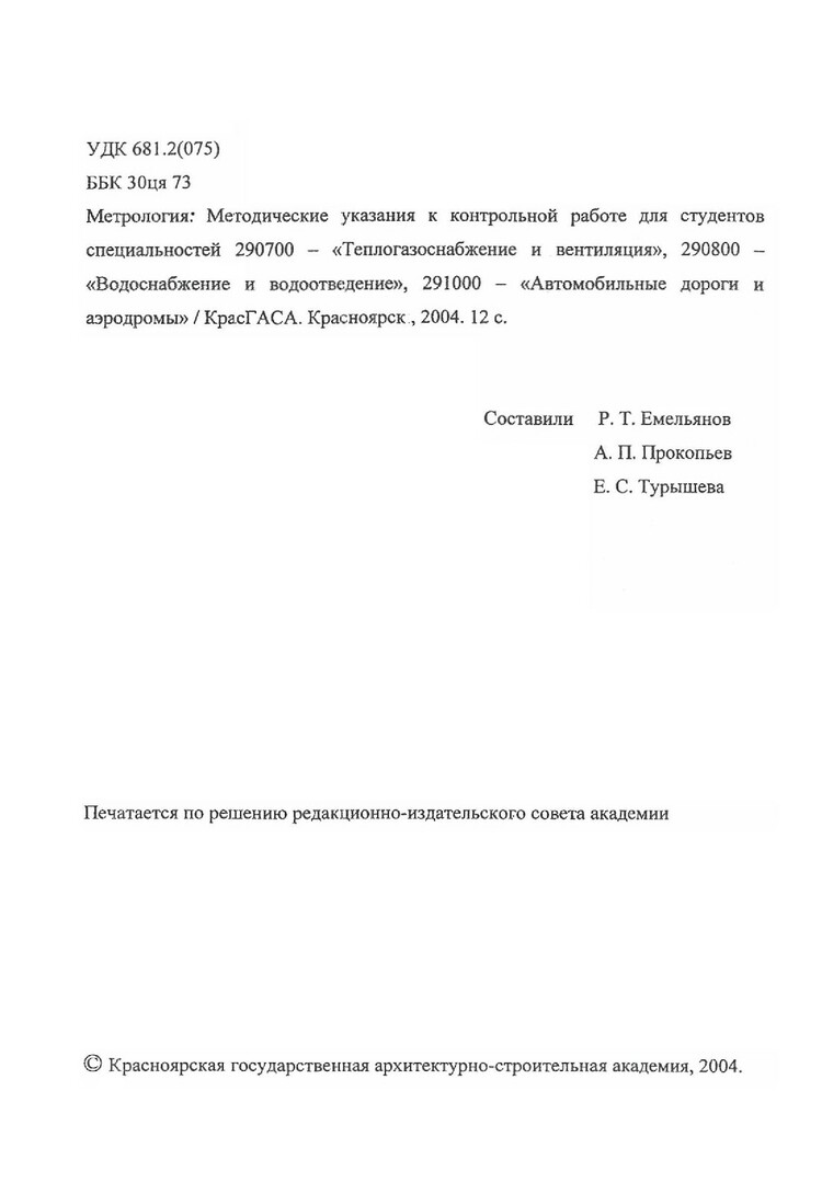 Библиографическое описание:Метрология : методические указания к контрольной работе для студентов спец. 290700 "Теплогазоснабжение и вентиляция", 290800 "Водоснабжение и водоотведение", 291000 "Автомобильные дороги и аэродромы" / сост.: Р.Т. Емельянов, Р.Т. Прокопьев, Е.С. Турышева. - Красноярск : КрасГАСА, 2004. - 12 с.