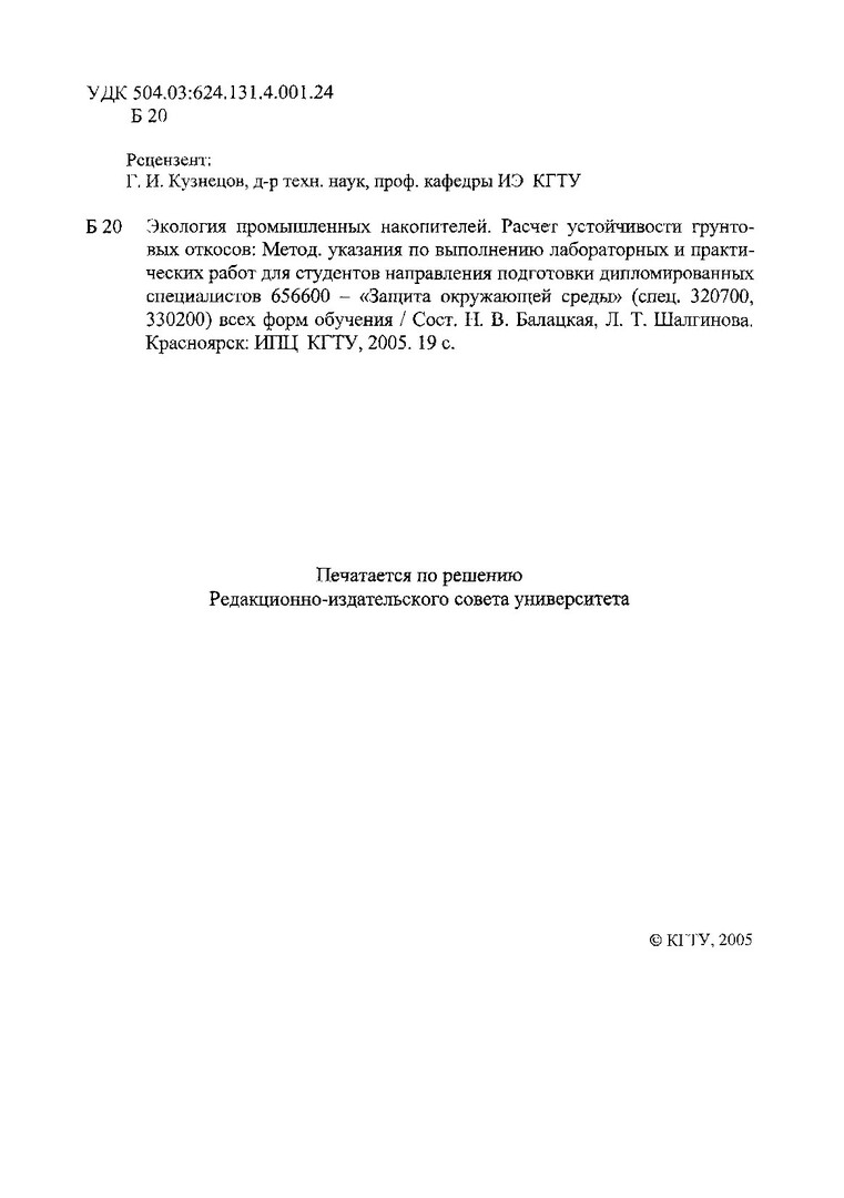 Библиографическое описание:Балацкая, Наталья Владимировна. Экология промышленных накопителей. Расчет устойчивости грунтовых откосов : метод. указ. по выполнению лаб. и практ. работ для студентов направления подгот. дипломир. спец. 656600 всех форм обуч. / Н. В. Балацкая, Л. Т. Шалгинова ; Краснояр. гос. техн. ун-т. - Красноярск : ИПЦ КГТУ, 2005. - 19 с. - (Защита окружающей среды). - Текст : непосредственный + Текст : электронный.
