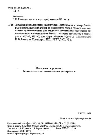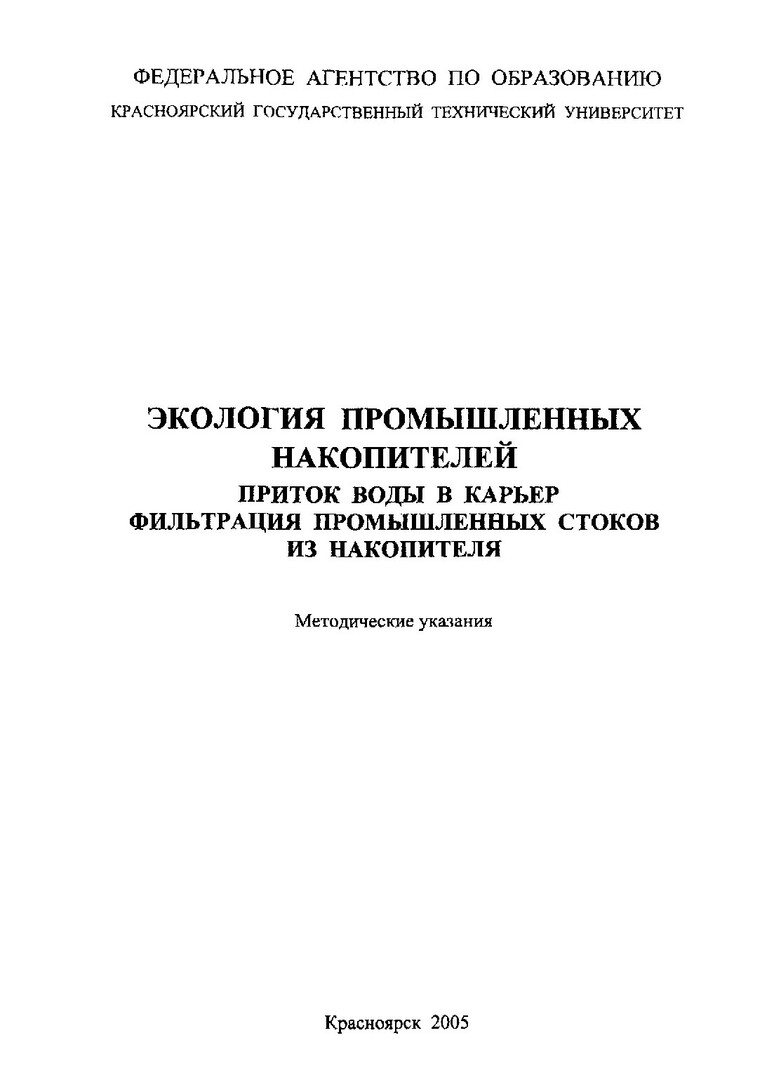 Библиографическое описание:Шалгинова, Людмила Тимофеевна. Экология промышленных накопителей. Приток воды в карьер. Фильтрация промышленных стоков из накопителя : метод. указ. по курсовому проектированию для студентов направлений подгот. дипломир. спец. 656600 всех форм обучения / Л. Т. Шалгинова, Н. В. Балацкая ; Краснояр. гос. техн. ун-т. - Красноярск : ИПЦ КГТУ, 2005. - 32 с. - (Защита окружающей среды). - Текст : непосредственный + Текст : электронный.