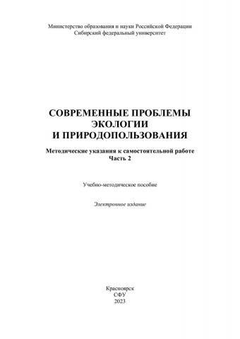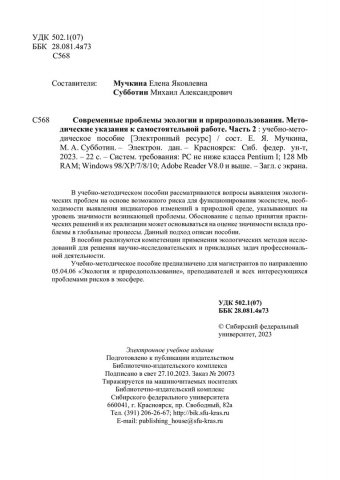 Библиографическое описание: Современные проблемы экологии и природопользования. Методические указания к самостоятельной работе. Часть 2 : учебно-методическое пособие / Сиб. федер. ун-т, Ин-т экологии и географии ; сост.: Е. Я. Мучкина, М. А. Субботин. - Электрон. текстовые дан. (pdf, 0,6 Мб). - Красноярск : СФУ, 2023 (2023-10-27). - 22 с. - Загл. с титул. экрана. - Изд. № 2023-20073 : Б. ц. - Текст : электронный.