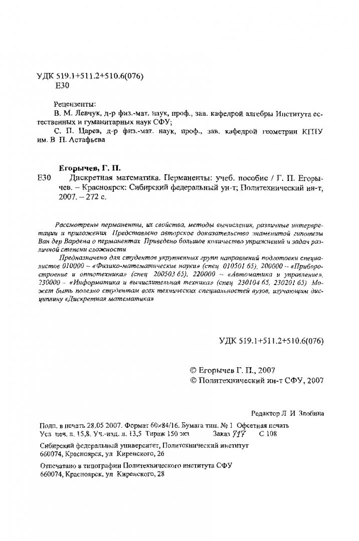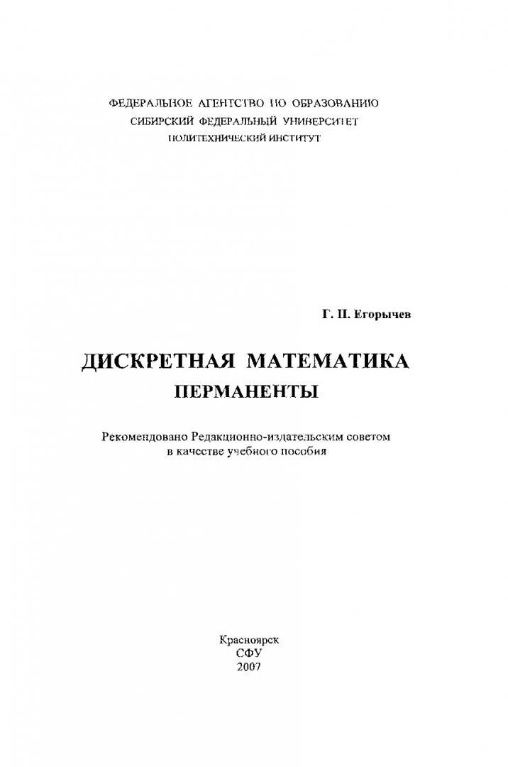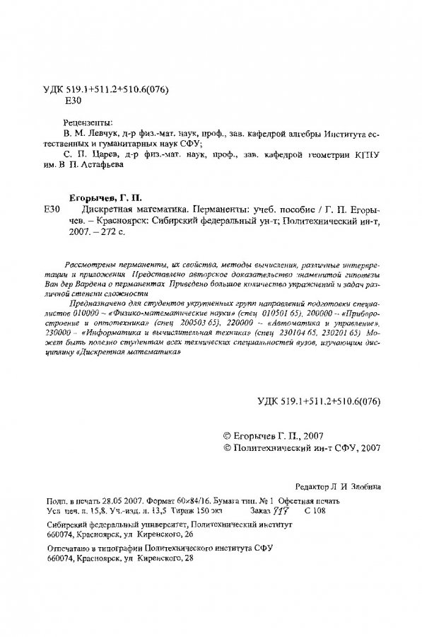Библиографическое описание: Егорычев, Георгий Петрович. Дискретная математика. Перманенты : учеб. пособие / Г. П. Егорычев ; Сиб. федер. ун-т, Политехн. ин-т. - Красноярск : СФУ, 2007. - 272 с. - Библиогр.: с. 270-272. - 150 экз. - Текст : непосредственный + Текст : электронный.