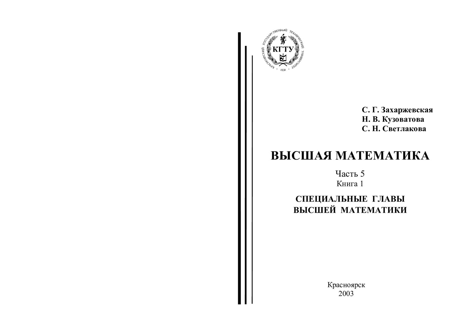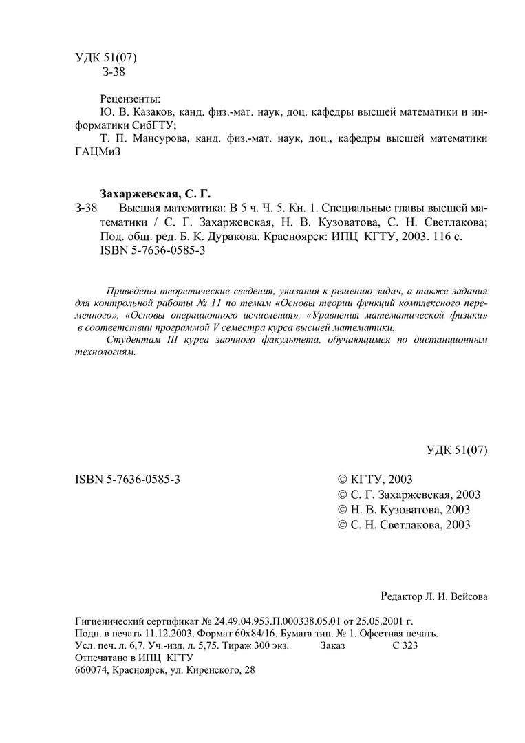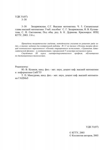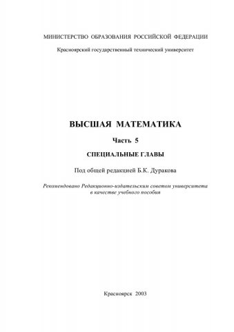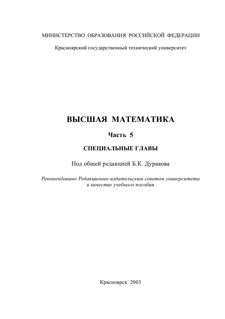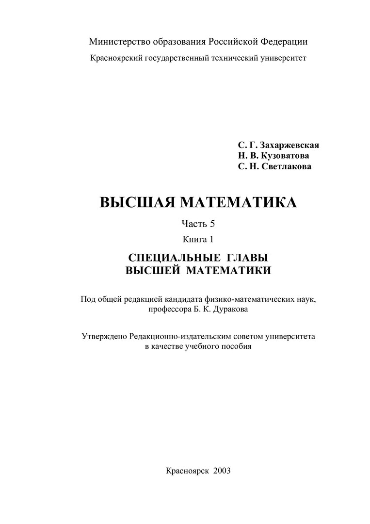 Захаржевская, С.Г. Высшая математика : учебные пособия / С.Г. Захаржевская, Н.В. Кузоватова, С.Н. Светлакова; Ред. Б.К. Дураков; Краснояр. гос. техн. ун-т. - Красноярск : ИПЦ КГТУ, 2003 - . - (Система открытого образования). - ISBN 5-7636-0585-3. - Текст : непосредственный. + Текст : электронный. Ч. 5, Кн. 1 : Специальные главы высшей математики. - 2003. - 116 с. - ISBN 5-17-011011-1