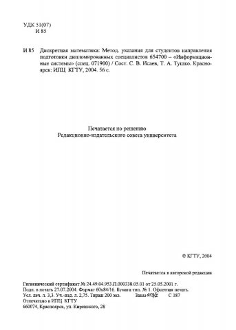 Библиографическое описание:Исаев, С. В. Дискретная математика : метод. указ. для студентов направления подгот. дипломир. спец. 654700- "Информационные системы" (спец.071900) / С. В. Исаев, Т. А. Тушко ; Краснояр. гос. техн. ун-т. - Красноярск : ИПЦ КГТУ, 2004. - 56 с. - (Учебно-методическая литература). - Текст : непосредственный + Текст : электронный.