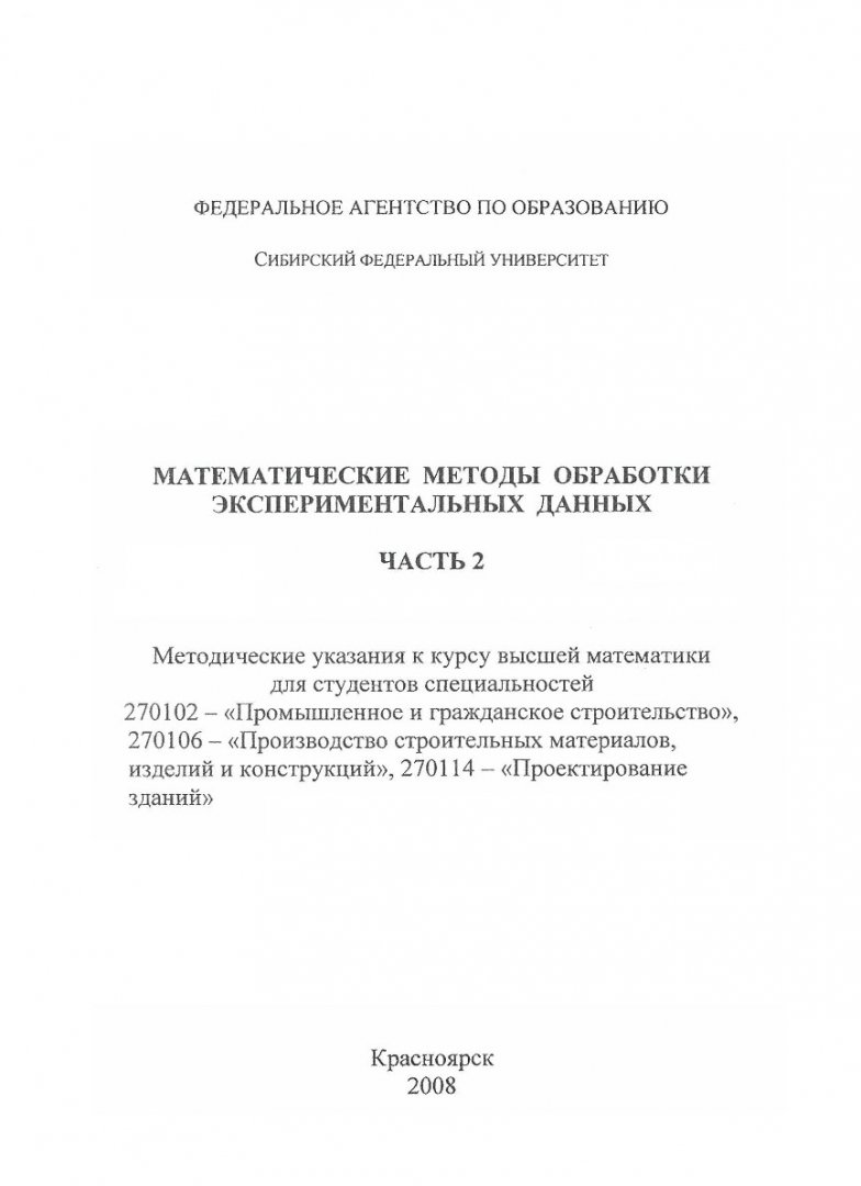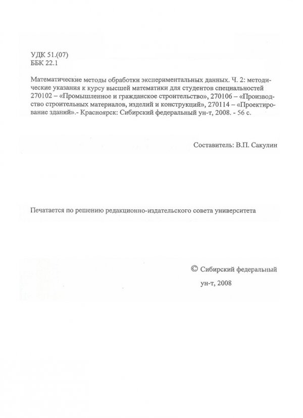 Библиографическое описание:Математические методы обработки экспериментальных данных : метод. указания к курсу высшей математики для студентов специальностей 270102 - "Пром. и гражд. стр-во", 270106 - "Производство строит. материалов изделий и конструкций", 270114 - Проектирование зданий". Ч. 2 / сост. В. П. Сакулин. - Красноярск : СФУ, 2008. - 56 с.