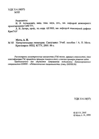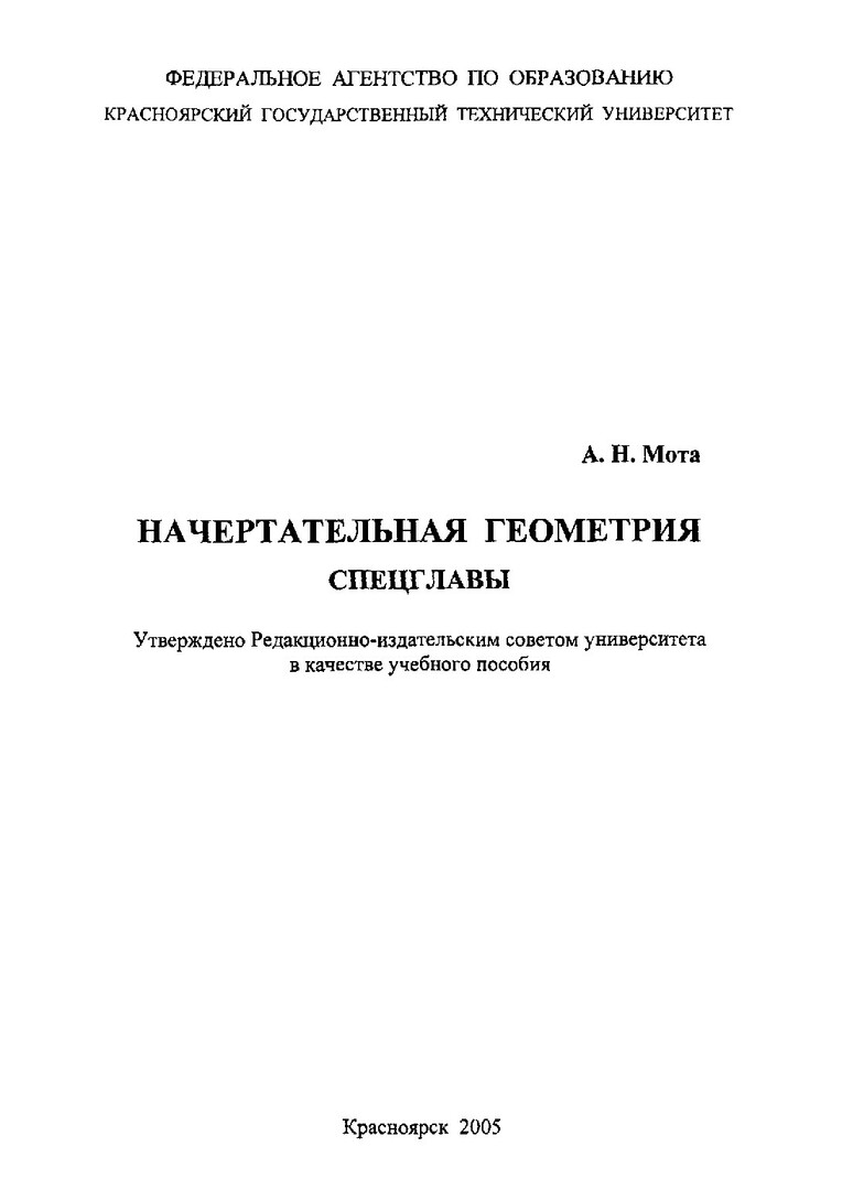 Библиографическое описание:Мота, Августа Николаевна. Начертательная геометрия. Спецглавы : учеб. пособие / А. Н. Мота ; Краснояр. гос. техн. ун-т. - Красноярск : ИПЦ КГТУ, 2005. - 86 с. : ил. - Текст : непосредственный + Текст : электронный.