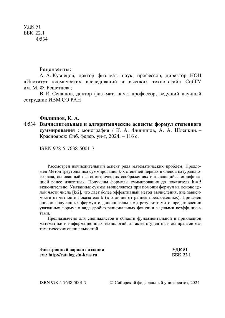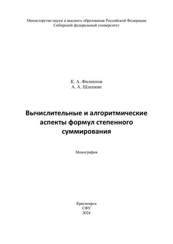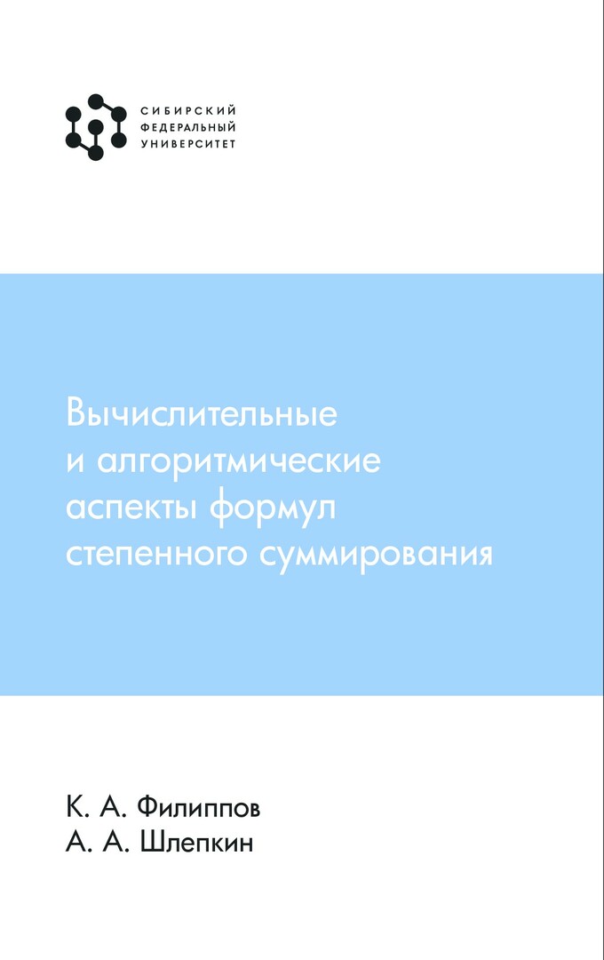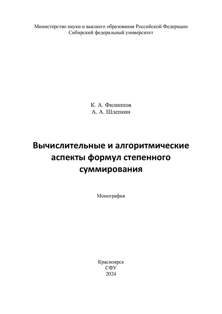 Библиографическое описание: Филиппов, Константин Анатольевич. Вычислительные и алгоритмические аспекты формул степенного суммирования : монография / К. А. Филиппов, А. А. Шлепкин ; [рец.: А. А. Кузнецов, В. И. Сенашов] ; Сибирский федеральный университет . - Красноярск : СФУ, 2024 (2024-06-18). - 112 с., 6,7 усл. печ. л. : рис. - Библиогр.: с. 111-112. - 500 экз. - ISBN 978-5-7638-5001-7 : 107.88 р. - Изд. № 2024-22105. - Текст : непосредственный + Текст : электронный.