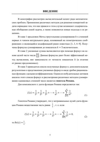 Аннотация: Рассмотрен вычислительный аспект ряда математических проблем. Предложен Метод треугольника суммирования k-х степеней первых n членов натурального ряда, основанный на геометрических соображениях и являющийся модификацией ранее известных. Получены формулы суммирования до показателя k = 5 включительно. Указанные суммы вычисляются при помощи формул на основе целой части числа [k/2], что дает более эффективный метод вычисления, вне зависимости от четности показателя k (в отличие от раннее предложенных). Приведен список полученных формул с дополнительными результатами о представлении указанных формул в виде дробно рациональных функции с целыми коэффициентами. Предназначено для специалистов в области фундаментальной и прикладной математики и информационных технологий, а также студентов и аспирантов математических специальностей.