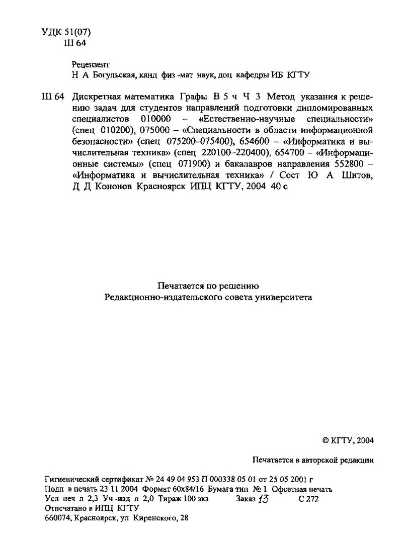 Библиографическое описание:Шитов, Юрий Александрович. Дискретная математика. Графы : метод. указ. к решению задач для студентов направлений подгот. дипломир. спец. 010000, 075200, 654600, 654700 и бакалавров направления 552800 / Ю. А. Шитов, Д. Д. Кононов. - Красноярск : ИПЦ КГТУ, 2004 - . - (Учебно-методическая литература). - Текст : непосредственный. + Текст : электронный. Ч. 3. - 2004. - 40 с.