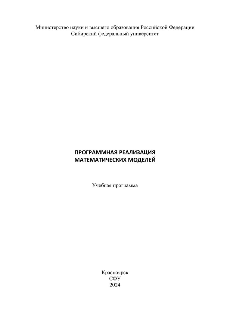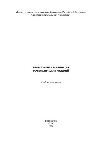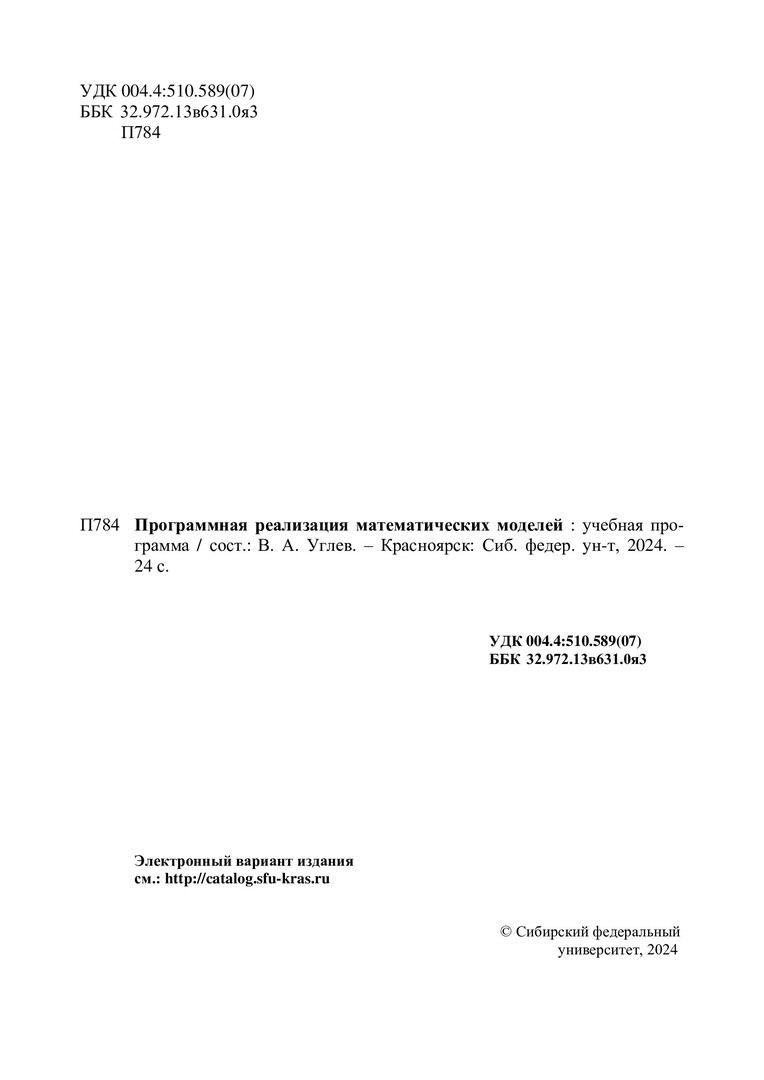 Библиографическое описание:Программная реализация математических моделей : учебная программа / Сибирский федеральный университет ; сост. В. А. Углев. - Электрон. текстовые дан. (1,5 Мб). - Красноярск : СФУ, 2024 (2024-05-20). - 24 с. : табл. - Загл. с титул. экрана. - Электрон. версия печ. публикации . - 100 экз. - Изд. № 2024-21860 : Б. ц. - Текст : электронный.