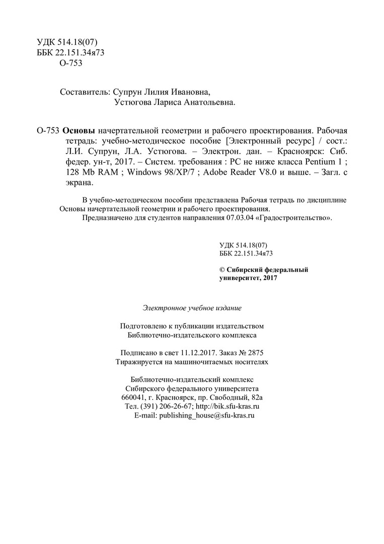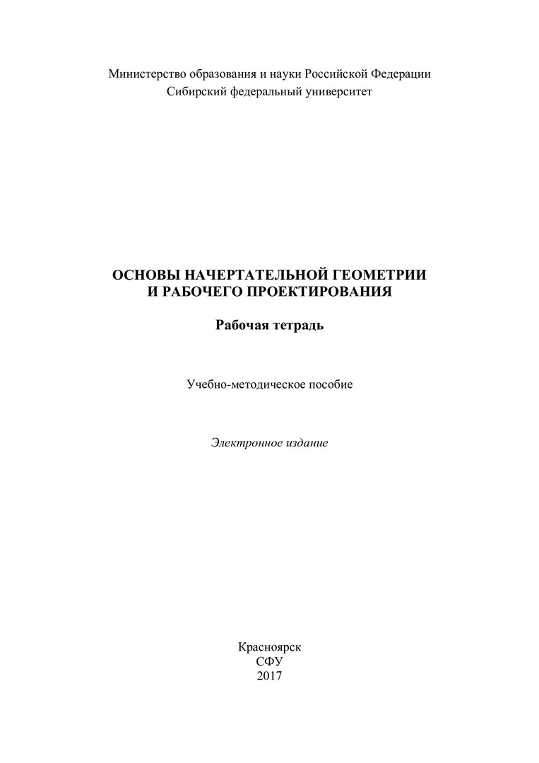 Библиографическое описание:Основы начертательной геометрии и рабочего проектирования. Рабочая тетрадь : учебно-методическое пособие / Сиб. федер. ун-т, Ин-т архитектуры и дизайна ; сост.: Л. И. Супрун, Л. А. Устюгова. - Электрон. текстовые дан. (pdf, 0,6 Мб). - Красноярск : СФУ, 2017. - Загл. с титул. экрана. - Изд. № 2017-2875 : Б. ц. - Текст : непосредственный.