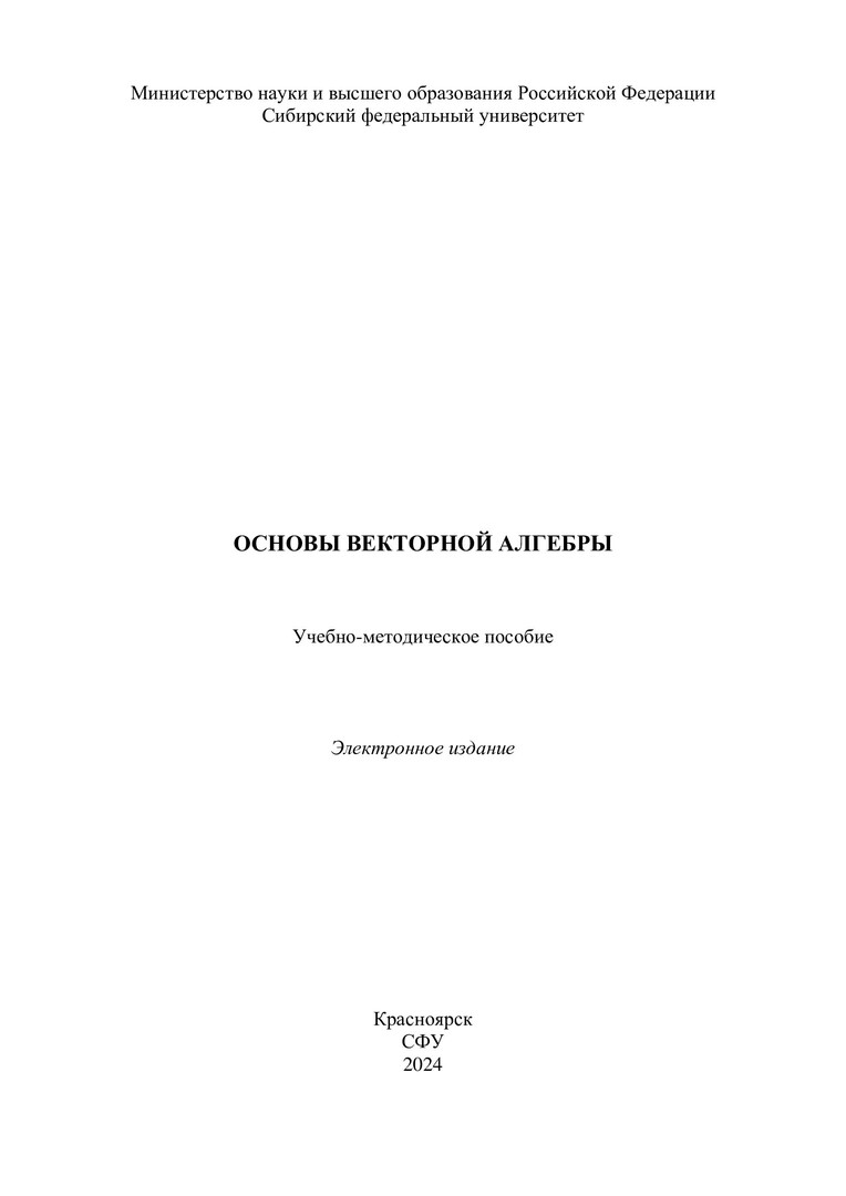 Библиографическое описание: Основы векторной алгебры : учебно-методическое пособие / Сиб. федер. ун-т, Ин-т математики и фундамент. информатики ; сост.: И. В. Киреев, Н. Н. Рыбакова. - Электрон. текстовые дан. (pdf, 0,8 Мб). - Красноярск : СФУ, 2024 (2024-04-19). - 63 с. - Загл. с титул. экрана. - Изд. № 2024-21386 : Б. ц. - Текст : электронный.