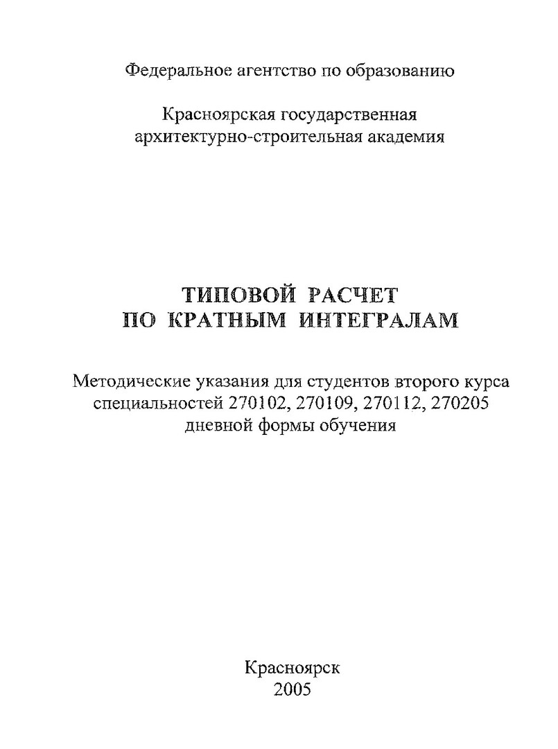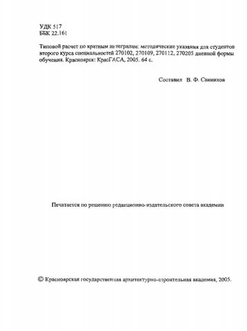 Библиографическое описание:Типовой расчет по кратным интегралам : метод. указания для студентов 2 курса спец.: 270102, 270109, 270112, 270205 дневной формы обучения / сост. В.Ф. Санников. - Красноярск : КрасГАСА, 2005. - 64 с.