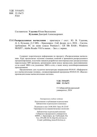 Библиографическое описание: Распределенные вычисления : практикум / Сиб. федер. ун-т, Ин-т космич. и информ. технологий ; сост.: Ю. В. Удалова, Д. А. Кузьмин. - Электрон. текстовые дан. (pdf, 2 Мб). - Красноярск : СФУ, 2024 (2024-06-24). - 102 с. - Загл. с титул. экрана. - Изд. № 2024-22145 : Б. ц. - Текст : электронный.