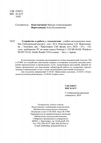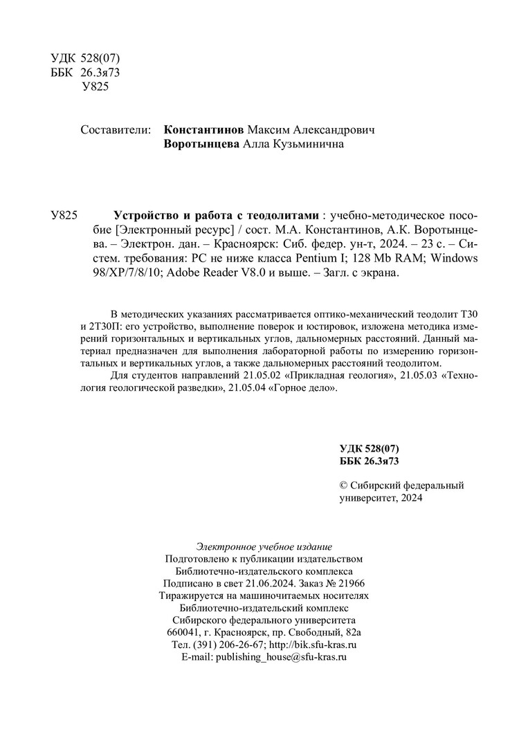 Библиографическое описание: Устройство и работа с теодолитами : учебно-методическое пособие / Сиб. федер. ун-т, Ин-т цветных металлов ; сост.: М. А. Константинов, А. К. Воротынцева. - Электрон. текстовые дан. (pdf, 1 Мб). - Красноярск : СФУ, 2024. - 23 с. - Загл. с титул. экрана. - Изд. № 2024-21966 : Б. ц. - Текст : электронный.