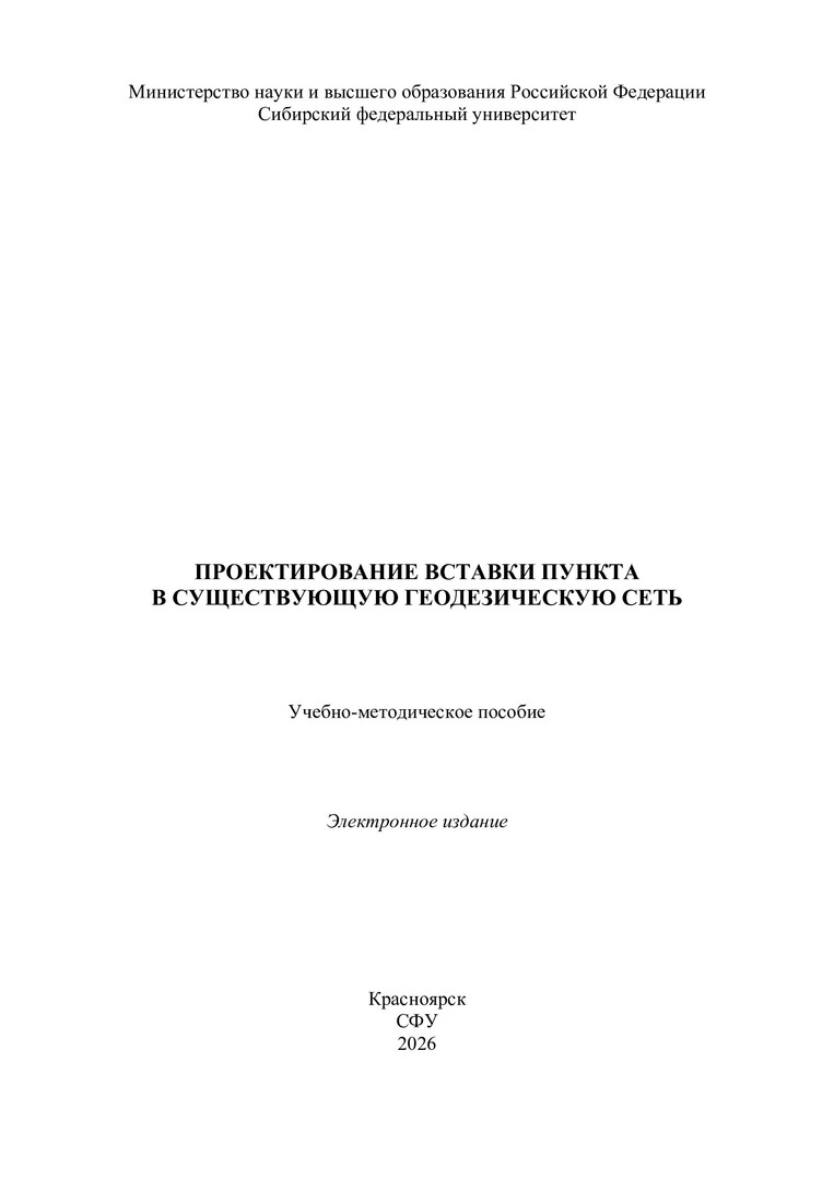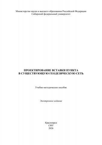 Библиографическое описание:Проектирование вставки пункта в существующую геодезическую сеть : учебно-методическое пособие / Сиб. федер. ун-т, Ин-т цветных металлов ; сост.: М. А. Константинов, П. С. Шпаков, Ю. Л. Юнаков. - Электрон. текстовые дан. (pdf, 7.3 Мб). - Красноярск : СФУ, 2026 (2026-03-03). - 62 с. - Загл. с титул. экрана. - Изд. № 2026-26237 : Б. ц. - Текст : электронный.