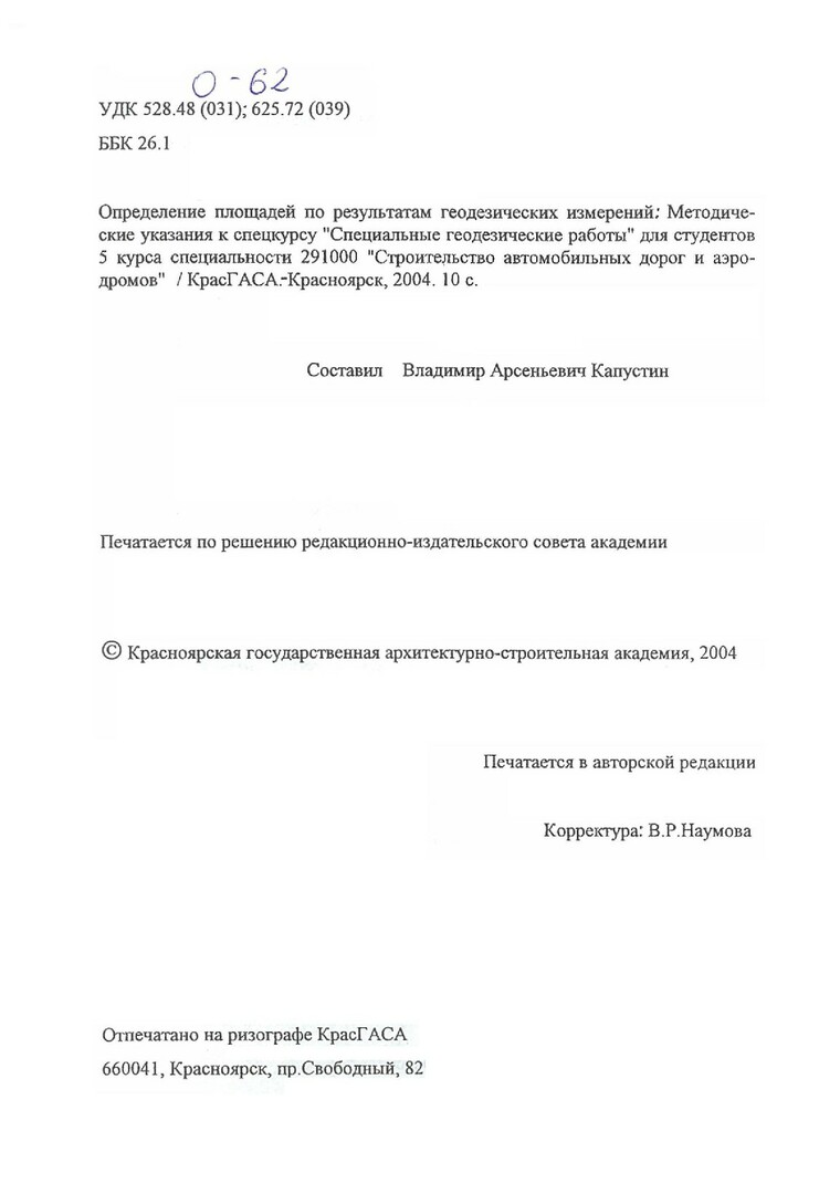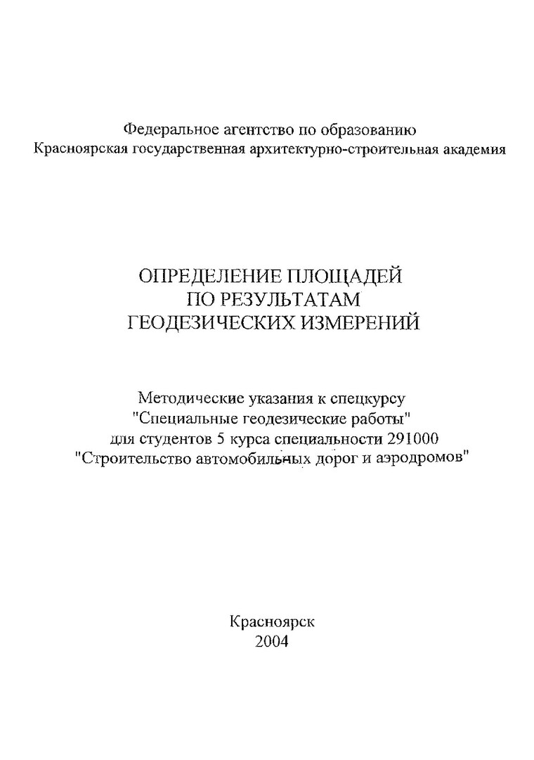 Библиографическое описание:Определение площадей по результатам геодезических измерений : методические указания к спецкурсу "Специальные геодезические работы" для студентов 5 курса спец. 291000 "Строительство автомобильных дорог и аэродромов" / сост. В.А. Капустин. - Красноярск : КрасГАСА, 2004. - 10 с.