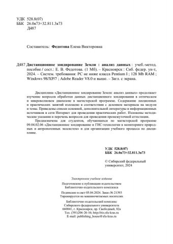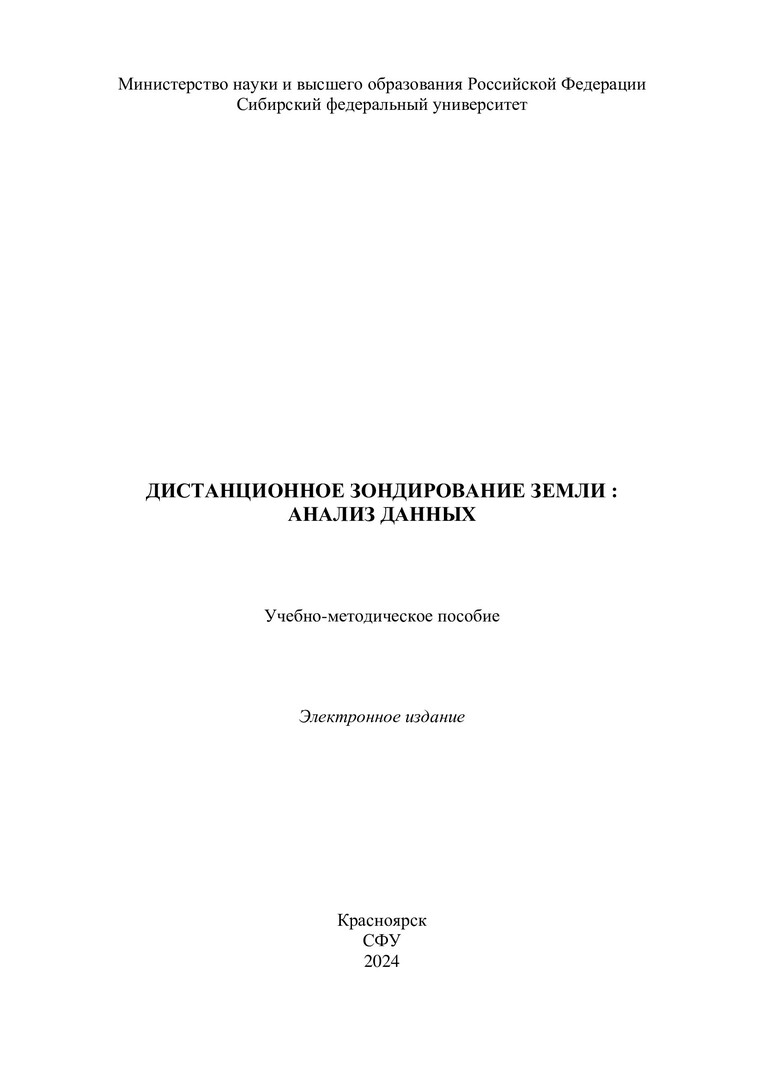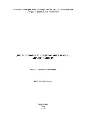 Библиографическое описание: Дистанционное зондирование земли : анализ данных : учебно-методическое пособие / Сиб. федер. ун-т, Ин-т космич. и информ. технологий ; сост. Е. В. Федотова. - Электрон. текстовые дан. (pdf, 1,1 Мб). - Красноярск : СФУ, 2024 (04.2024-04-05). - 18 с. - Загл. с титул. экрана. - Изд. № 2024-21393 : Б. ц. - Текст : электронный.