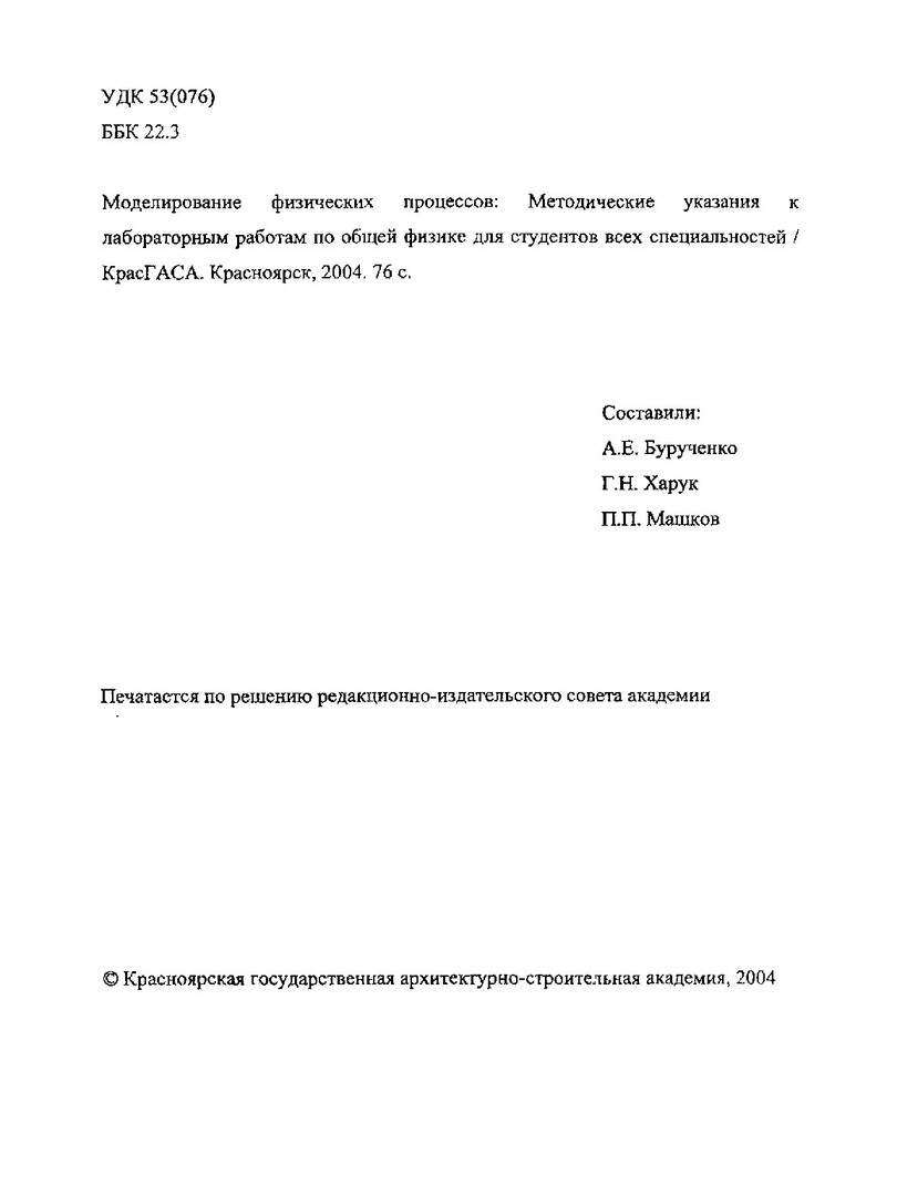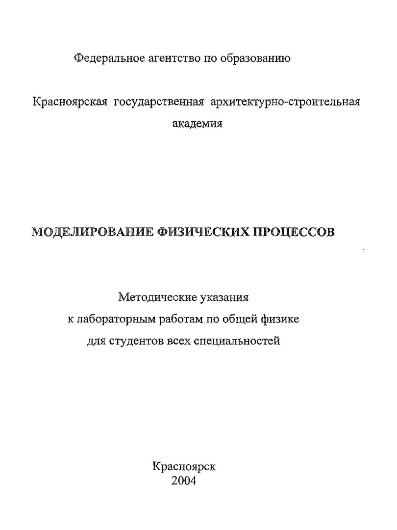 Библиографическое описание:Моделирование физических процессов : метод. указания к лаб. работам по физике для студ. всех спец. / сост.: А.Е. Бурученко, Г.Н. Харук, П.П. Машков. - Красноярск : КрасГАСА, 2004. - 76 с.