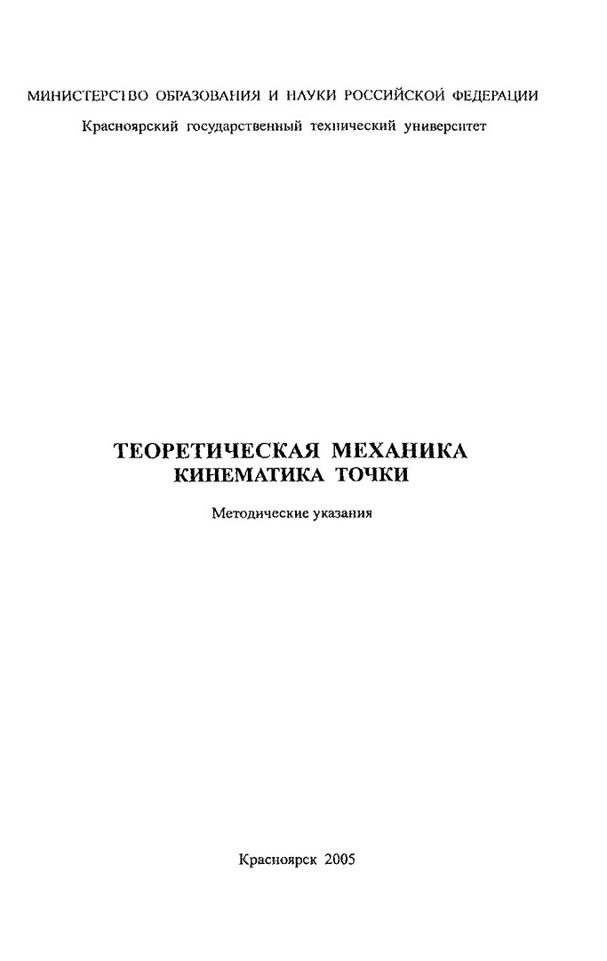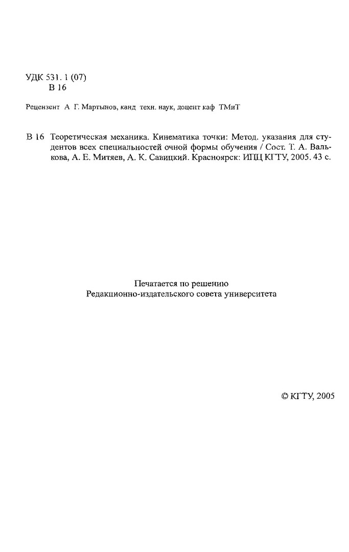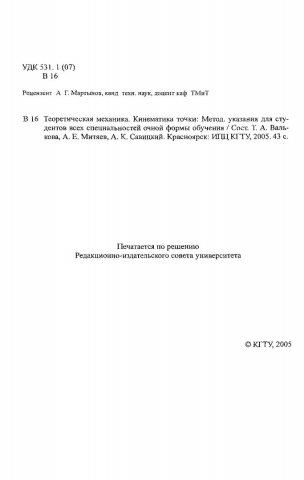 Библиографическое описание:Валькова, Татьяна Александровна. Теоретическая механика. Кинематика точки : метод. указ. для студентов всех спец. очной формы обучения / Т. А. Валькова, А. Е. Митяев, А. К. Савицкий ; Краснояр. гос. техн. ун-т. - Красноярск : ИПЦ КГТУ, 2005. - 43 с. - Текст : непосредственный + Текст : электронный.