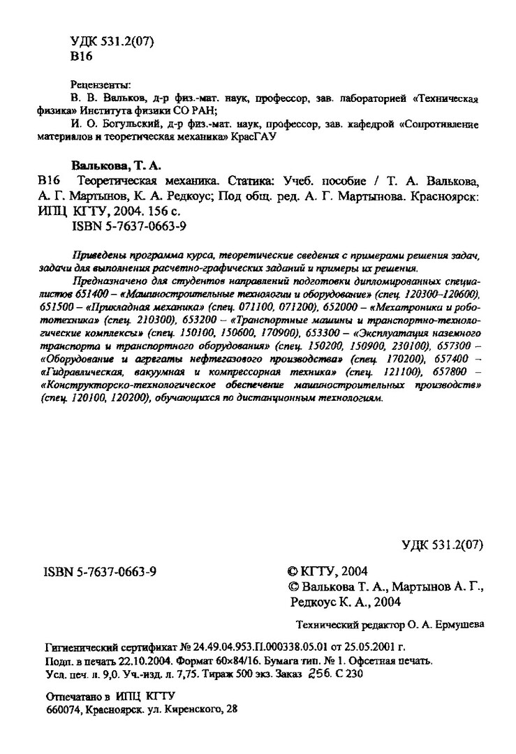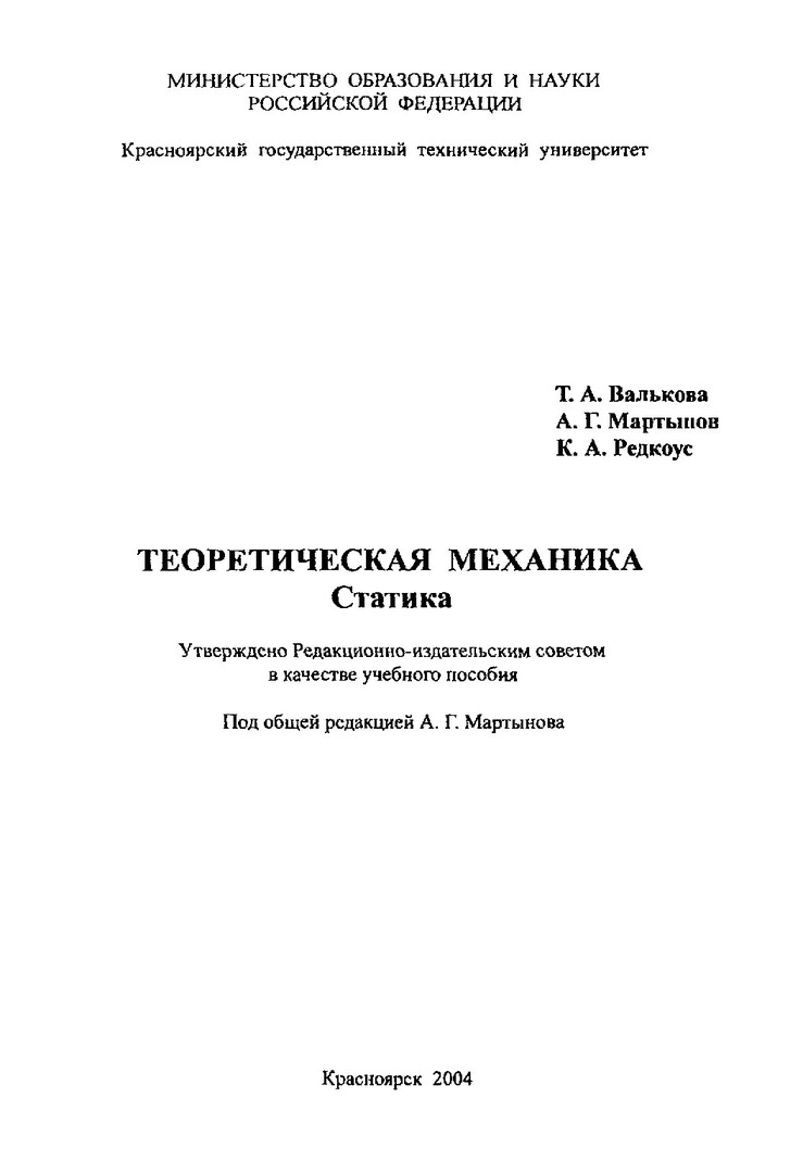 Библиографическое описание:Валькова, Татьяна Александровна. Теоретическая механика. Статика : учеб. пособиеFТ. А. Валькова, А. Г. Мартынов, К. А. Редкоус ; ред. А. Г. Мартынов / Т. А. Валькова, А. Г. Мартынов, К. А. Редкоус ; ред. А. Г. Мартынов ; Краснояр. гос. техн. ун-т. - Красноярск : ИПЦ КГТУ, 2004. - 156 с. : ил. - (Система открытого образования). - ISBN 5-7637-0663-9. - Текст : непосредственный + Текст : электронный.