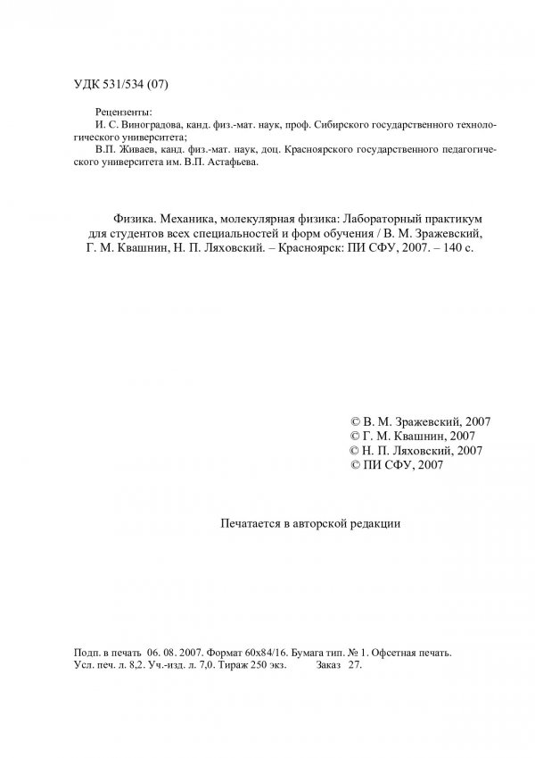 Библиографическое описание:Зражевский, В. М. Физика. Механика, молекулярная физика : Лабораторный практикум для студентов всех специальностей и форм обучения / В. М. Зражевский, Г. М. Квашнин, Н. П. Ляховский. - Электрон. текстовые дан.(1,10 Мб). - Красноярск : СФУ Политехнический институт, 2007. - 142 с. : табл., рис., граф. - Загл. с титул. экрана. - Текст : непосредственный + Текст : электронный.