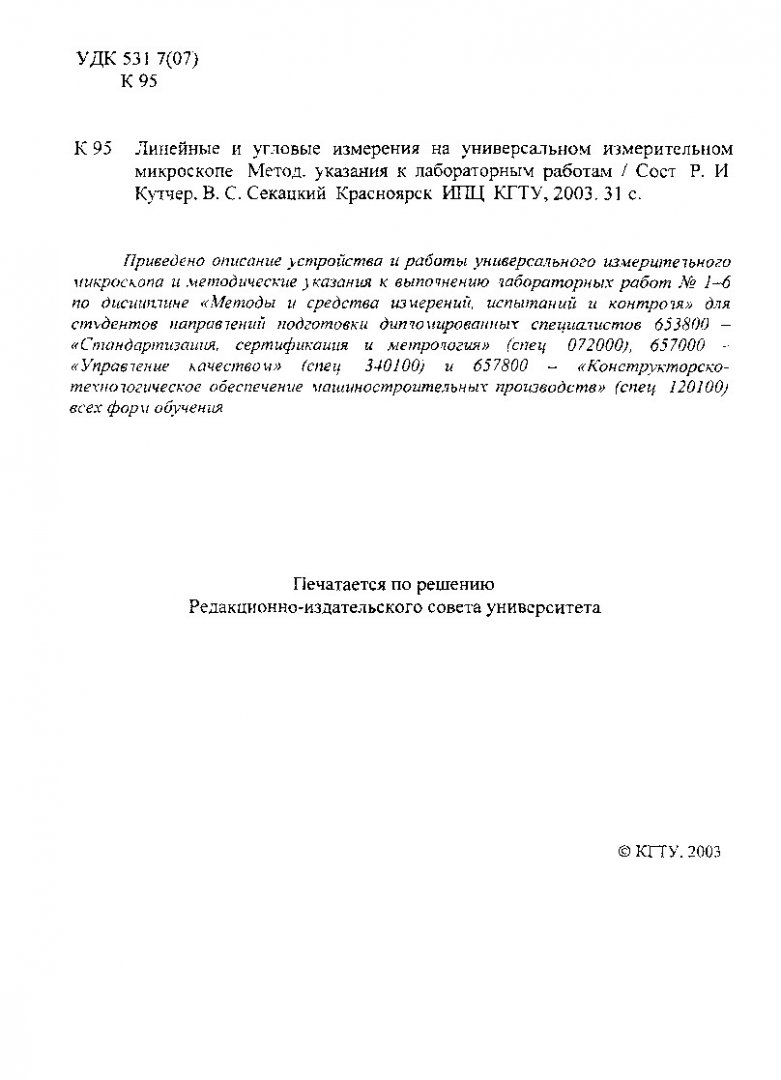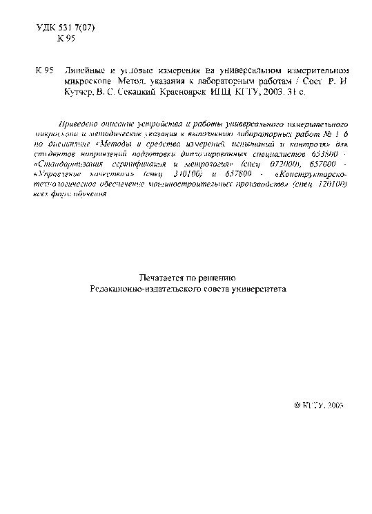 Библиографическое описание:Кутчер, Рудольф Иванович. Линейные и угловые измерения на универсальном измерительном микроскопе : метод. указ. к лаб. работам / Р. И. Кутчер, В. С. СекацкийGКраснояр. гос. техн. ун-т ; Краснояр. гос. техн. ун-т. - Красноярск : ИПЦ КГТУ, 2003. - 31 с. - Текст : непосредственный + Текст : электронный.