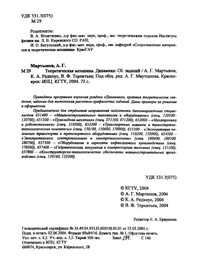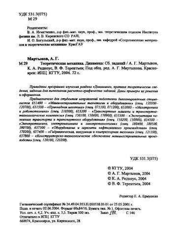 Библиографическое описание:Мартынов, А. Г. Теоретическая механика. Динамика : сборник заданий / А. Г. Мартынов, К. А. Редкоус, В. Ф. Терентьев ; Краснояр. гос. техн. ун-т. - Красноярск : ИПЦ КГТУ, 2004. - 72 с. - 13.00 р. - Текст : непосредственный + Текст : электронный.