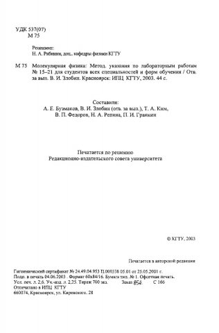 Библиографическое описание:Молекулярная физика : методические указания по лабораторным работам № 15-21 для студентов всех специальностей и форм обучения / А. Е. Бузмаков [и др.] ; ред. В. И. Злобин ; Краснояр. гос. техн. ун-т. - Красноярск : ИПЦ КГТУ, 2003. - 44 с. - Библиогр.: с. 43. - Текст : непосредственный + Текст : электронный.