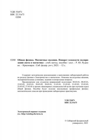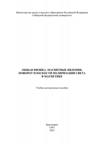 Библиографическое описание: Общая физика. Магнитные явления. Поворот плоскости поляризации света в магнетике : учебно-методическое пособие / Сибирский федеральный университет, Институт инженерной физики и радиоэлектроники ; сост. Р. Ю. Руденко. - Электрон. текстовые дан. (9,0 Мб). - Красноярск : СФУ, 2025 (2025-01-30). - 12 с. : цв. ил. - Загл. с титул. экрана. - Электрон. версия печ. публикации . - 100 экз. - Изд. № 2025-23661 : Б. ц. - Текст : электронный.