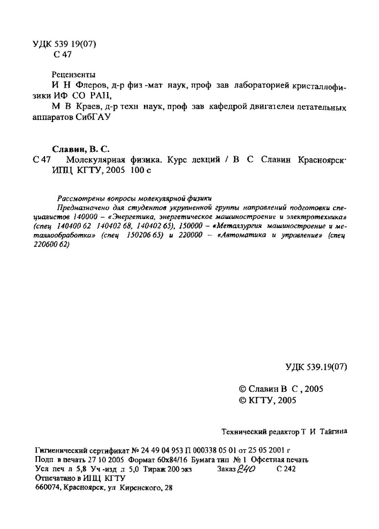 Библиографическое описание:Славин, Вадим Соломонович. Молекулярная физика : курс лекций / В. С. Славин ; Краснояр. гос. техн. ун-т. - Красноярск : ИПЦ КГТУ, 2005. - 100 с. : ил. - 200 экз. - Текст : непосредственный + Текст : электронный.