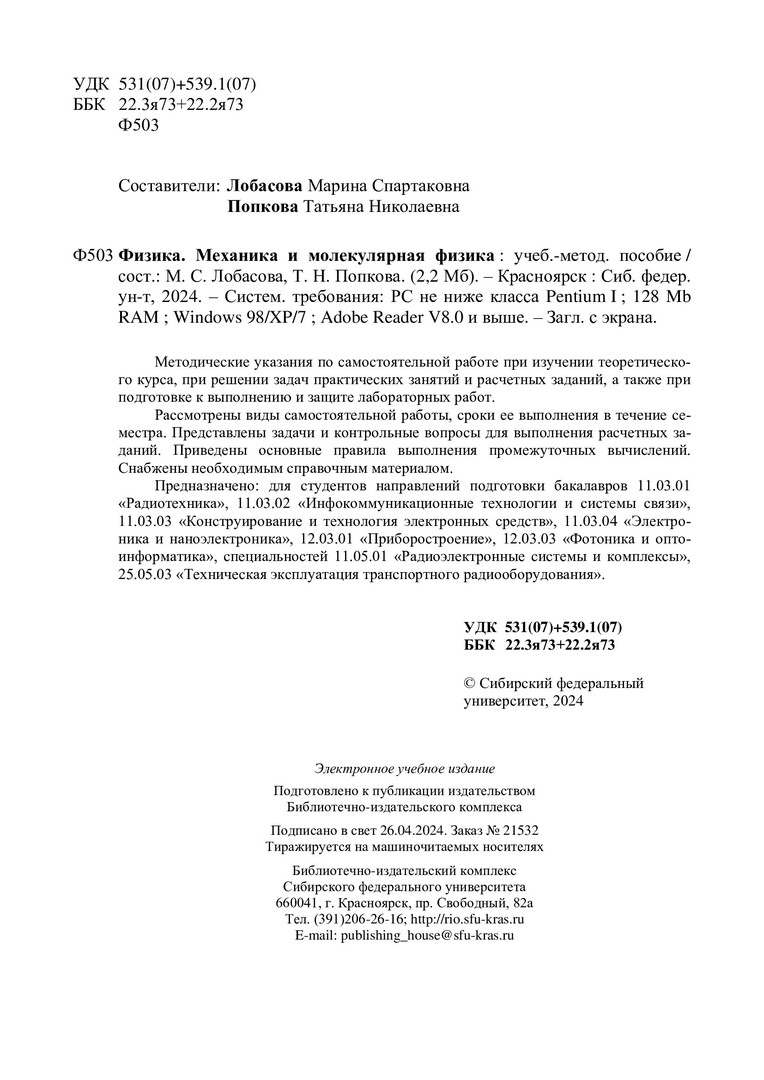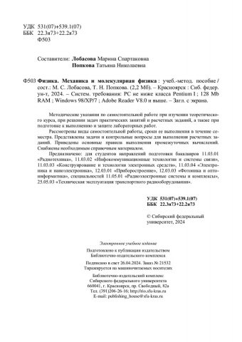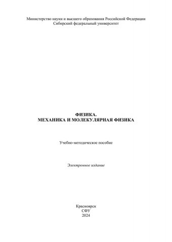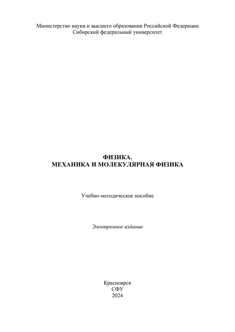 Библиографическое описание: Физика. Механика и молекулярная физика : учебно-методическое пособие / Сиб. федер. ун-т, Ин-т инж. физики и радиоэлектроники ; сост.: М. С. Лобасова, Т. Н. Попкова. - Электрон. текстовые дан. (pdf, 2,3 Мб). - Красноярск : СФУ, 2024 (2024-04-26). - 83 с. - Загл. с титул. экрана. - Изд. № 2024-21532 : Б. ц. - Текст : электронный.