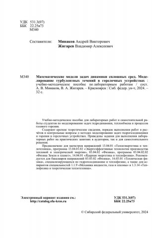 Библиографическое описание: Математические модели задач динамики сплошных сред. Моделирование турбулентных течений в горелочных устройствах. : учебно-методическое пособие по лабораторным работам / Сибирский федеральный университет, Институт инженерной физики и радиоэлектроники ; сост.: А. В. Минаков, В. А. Жигарев. - Электрон. текстовые дан. (5,8 Мб). - Красноярск : СФУ, 2024 (2024-06-04). - 32 с., 2.0 усл. печ. л. : ил., цв. ил. - Загл. с титул. экрана. - Электрон. версия печ. публикации . - Библиогр.: с. 30. - 100 экз. - Изд. № 2024-22053 : Б. ц. - Текст : электронный.