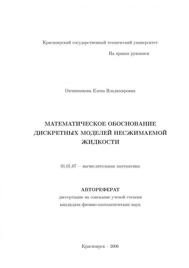 Овчинникова, Елена Владимировна. Математическое обоснование дискретных моделей несжимаемой жидкости : автореферат дис. ... канд. физ.-мат. наук : 01.01.07 : защищена 21.12.2006 / Е. В. Овчинникова ; науч. рук. А. М. Франк ; Краснояр. гос. техн. ун-т. - Красноярск, 2006. - 14 с. - Текст : непосредственный + Текст : электронный.