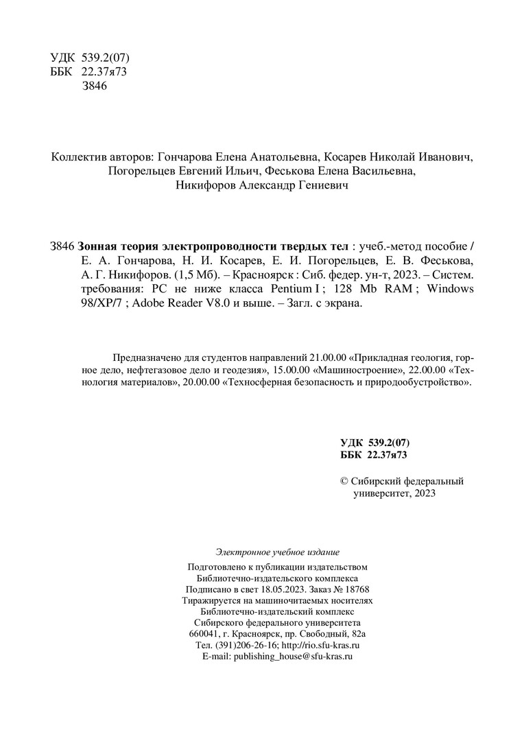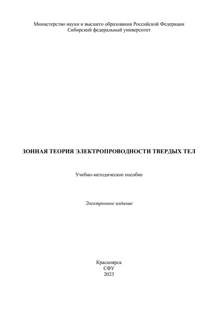 Библиографическое описание:Зонная теория электропроводности твердых тел : учебно-методическое пособие / Е. А. Гончарова, Н. И. Косарев, Е. И. Погорельцев [и др.]. ; Сибирский федеральный университет, Институт цветных металлов. - Электрон. текстовые дан. (pdf, 1,5 Мб). - Красноярск : СФУ, 2023 (2023-04-17). - 25 с. - Загл. с титул. экрана. - Изд. № 2023-18768 : Б. ц. - Текст : электронный.