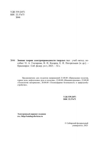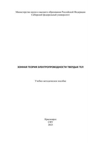 Библиографическое описание: Зонная теория электропроводности твердых тел : учебно-методическое пособие / Е. А. Гончарова, Н. И. Косарев, Е. И. Погорельцев, А. Г. Никифоров ; Сибирский федеральный университет, Институт цветных металлов. - Электрон. текстовые дан. - Красноярск : СФУ, 2023 (2023-11-29). - 32 с. : ил., табл. - Загл. с титул. экрана. - Электрон. версия печ. публикации . - Библиогр.: с. 31. - 100 экз. - Изд. № 2023-20567 : Б. ц. - Текст : электронный.