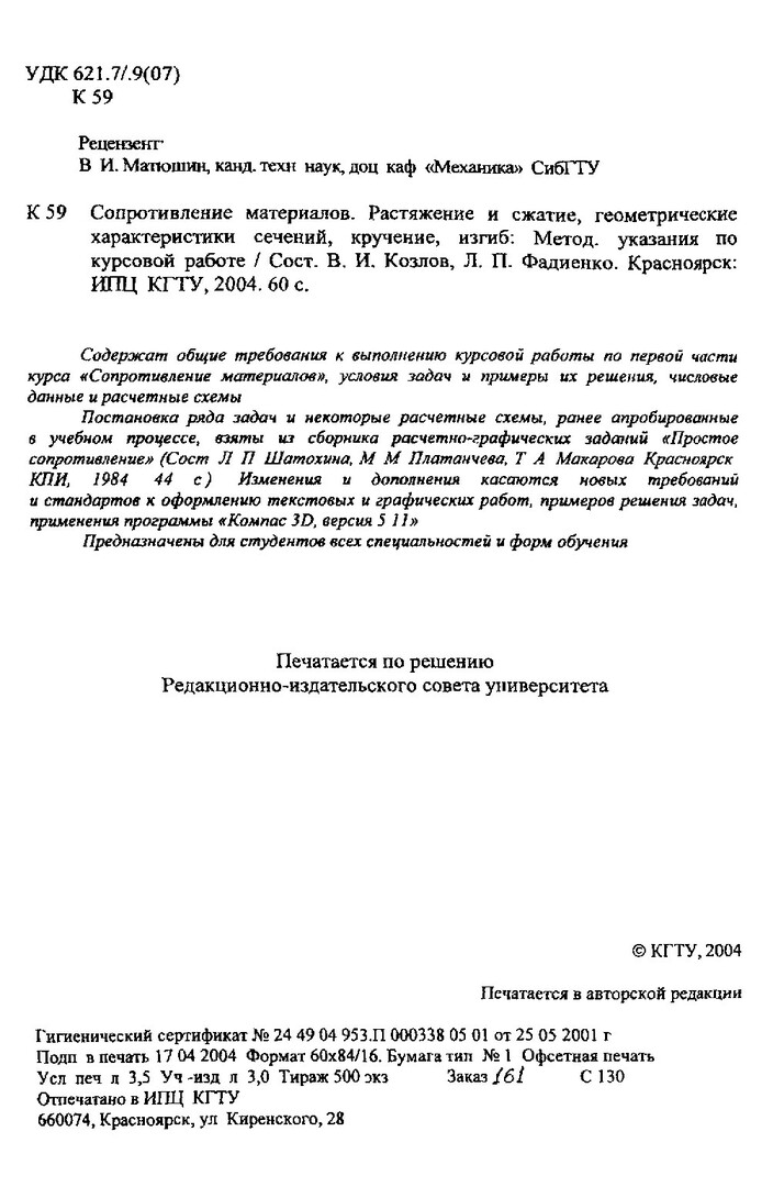 Библиографическое описание:Козлов, Владимир Игоревич. Сопротивление материалов. Растяжение и сжатие, геометрические характеристики сечений, кручение, изгиб : метод. указ. по курсовой работе / В. И. Козлов, Л. П. Фадиенко ; Краснояр. гос. техн. ун-т. - Электрон. текстовые дан. (1,6 Мб). - Красноярск : ИПЦ КГТУ, 2004. - Загл. с титул. экрана. - Электрон. версия печ. публикации . - Текст : непосредственный.