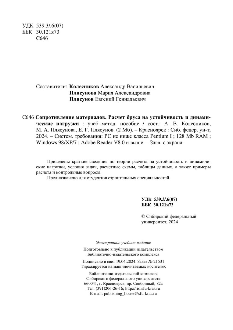 Библиографическое описание:Сопротивление материалов. Расчет бруса на устойчивость и динамические нагрузки : учебно-методическое пособие / Сиб. федер. ун-т, Инж.-строит. ин-т ; сост.: А. В. Колесников, М. А. Плясунова, Е. Г. Плясунов. - Электрон. текстовые дан. (pdf, 1,9 Мб). - Красноярск : СФУ, 2024 (2024-04-19). - 53 с. - Загл. с титул. экрана. - Изд. № 2024-21531 : Б. ц. - Текст : электронный.
