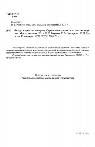 Библиографическое описание:Внукова, Наталья Григорьевна. Методы и средства контроля. Определение элементного состава вещества : методические указания / Н. Г. Внукова, Г. В. Бондаренко, Г. Н. Чурилов ; Краснояр. гос. техн. ун-т. - Красноярск : ИПЦ КГТУ, 2005. - 35 с. : ил., фото. - (Учебно-методическая литература). - Библиогр.: с. 34. - Текст : непосредственный + Текст : электронный.