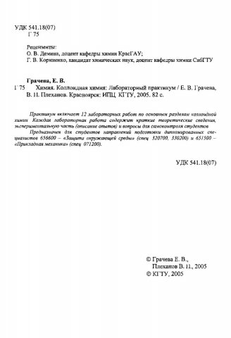 Библиографическое описание:Грачева, Екатерина Васильевна. Химия. Коллоидная химия : лаб. практикум / Е. В. Грачева, В. П. Плеханов ; Краснояр. гос. техн. ун-т. - Красноярск : ИПЦ КГТУ, 2005. - 82 с. : ил. - (Учебное пособие). - Текст : непосредственный + Текст : электронный.