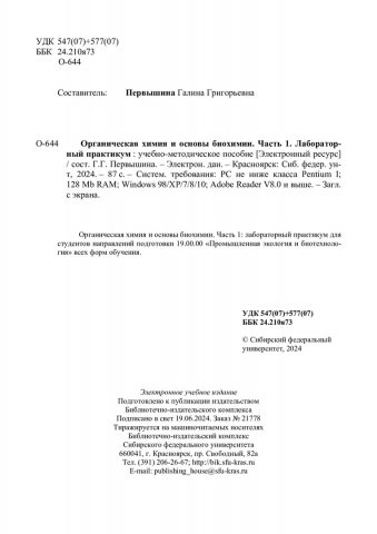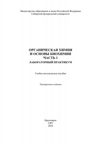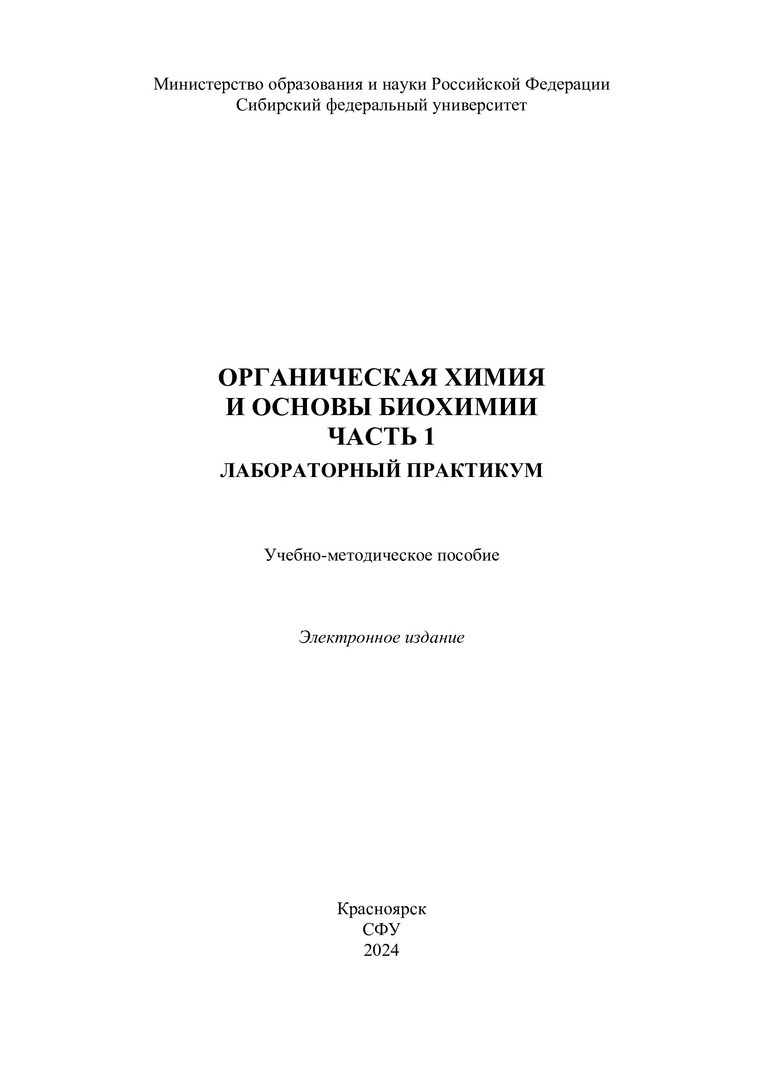 Библиографическое описание:Органическая химия и основы биохимии. Часть 1. Лабораторный практикум : учебно-методическое пособие / Сиб. федер. ун-т, Ин-т торговли и сферы услуг ; сост. Г. Г. Первышина. - Электрон. текстовые дан. (pdf, 2,7 Мб). - Красноярск : СФУ, 2024. - 87 с. - Загл. с титул. экрана. - Изд. № 2024-21778 : Б. ц. - Текст : электронный.