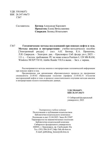 Библиографическое описание:Геохимические методы исследований при поисках нефти и газа. Методы анализа и интерпретации : учебно-методическое пособие / Сибирский федеральный университет, Институт нефти и газа ; сост.: А. К. Битнер, Е. В. Прокатень, Л. И. Свиридов. - Электрон. текстовые дан. (pdf, 5,6 Мб). - Красноярск : СФУ, 2025. - 111 с. - Загл. с титул. экрана. - Библиогр.: с. 110-111. - Изд. № 2025-23947 : Б. ц. - Текст : электронный.